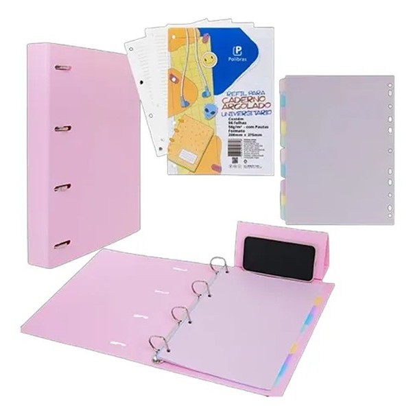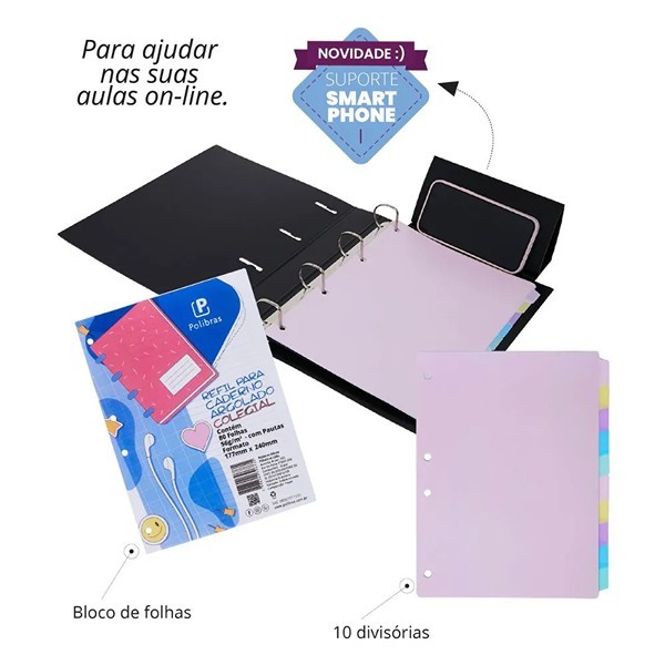 Fichário Argolado Universitário Refil 96fls C/ 10 Div e Suporte Celular - Polibras