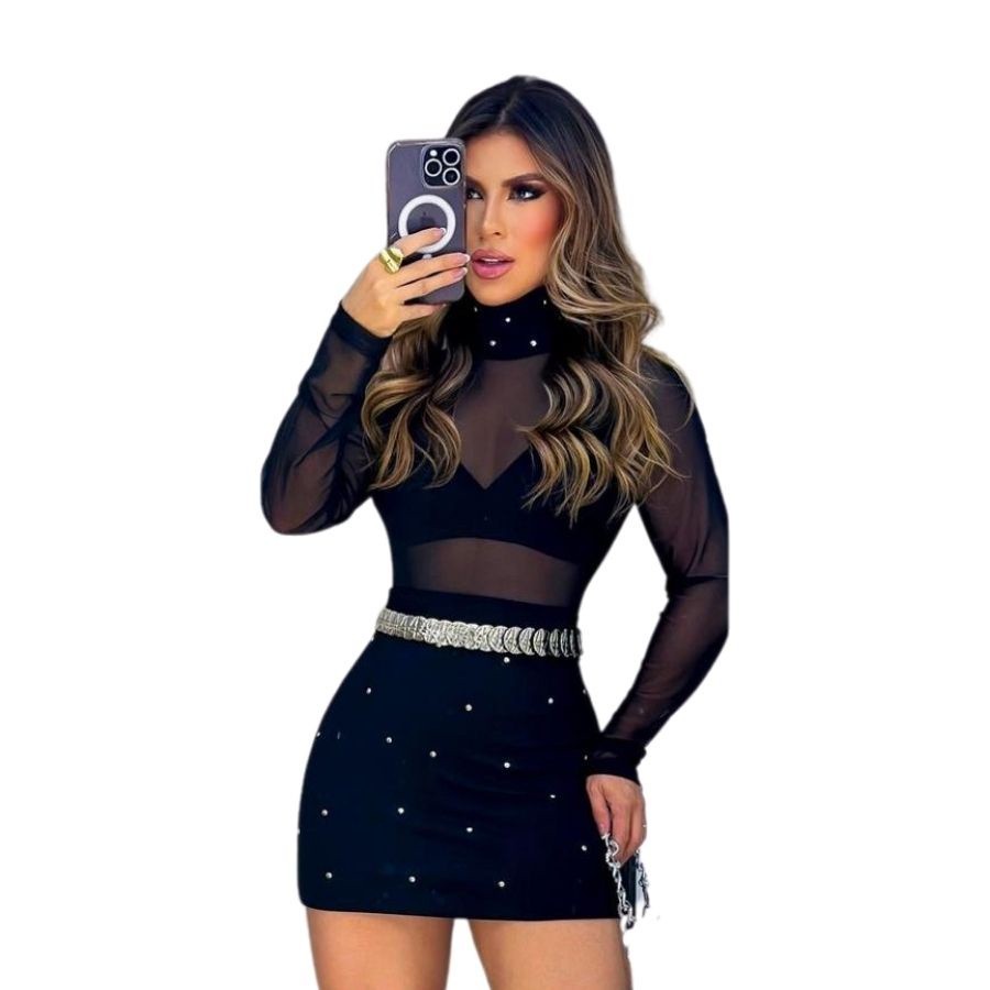 Conjunto Blusa Manga Longa Tule + Cropped + Saia C Stress 0543