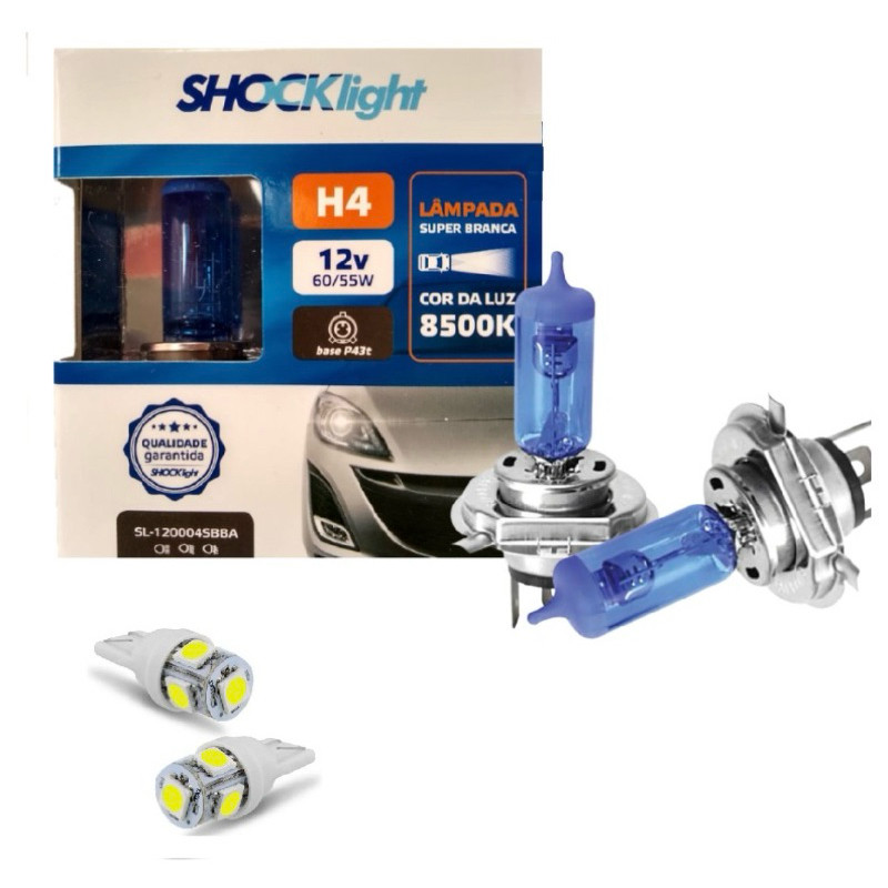 Par Lâmpadas Super Branca H4 8500k + Par Pingo T10 Universal