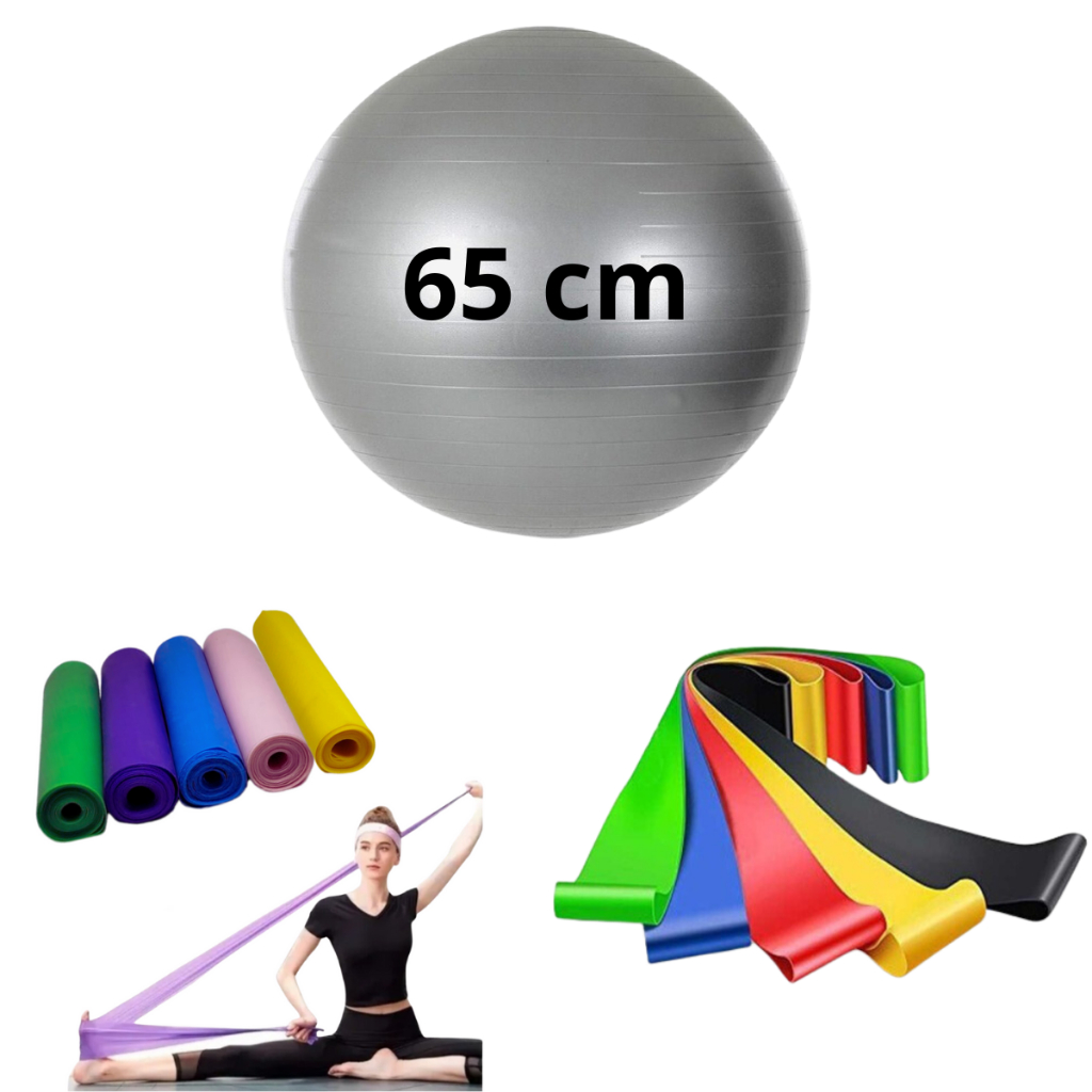 Bola Suiça Pilates Fisio 65cm + Faixa Elastica + 5 Mini Band Thera Funcional Yoga Academia Treino