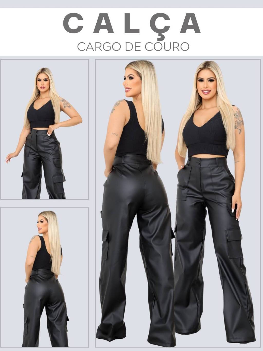 Calça Pantalona Wide Leg Reta Cargo Couro Fake Cintura Alta Moda Gringa Bolso Lateral