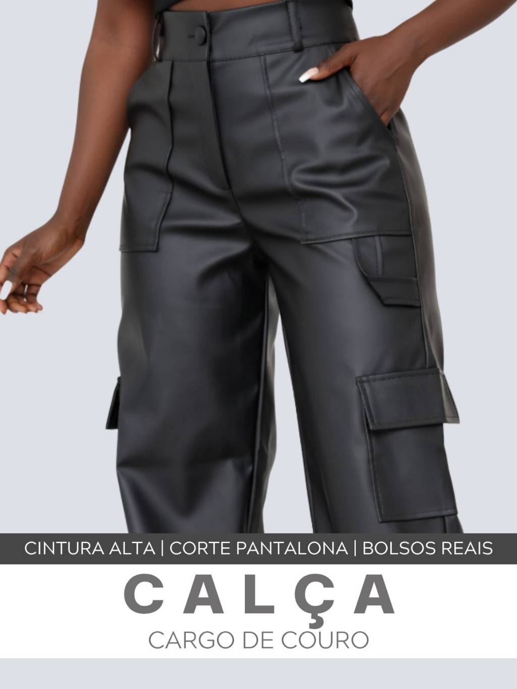 Calça Feminina Wide Leg Cargo Couro Elegante Cintura Alta Com Bolsos Reais Tendência Viralizada