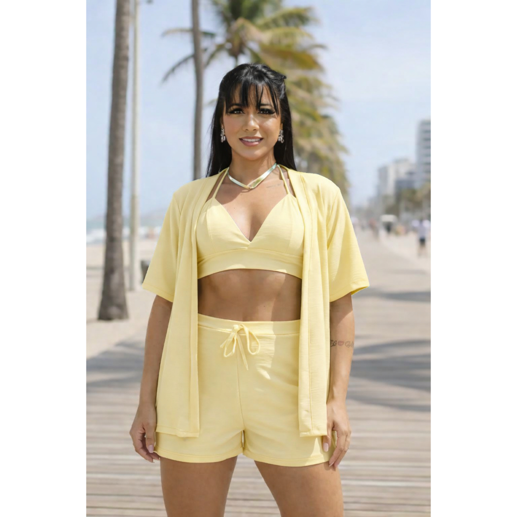 Conjunto Feminino kimono 3 Peças + Short e Cropped com Bojo Duna Não Amassa