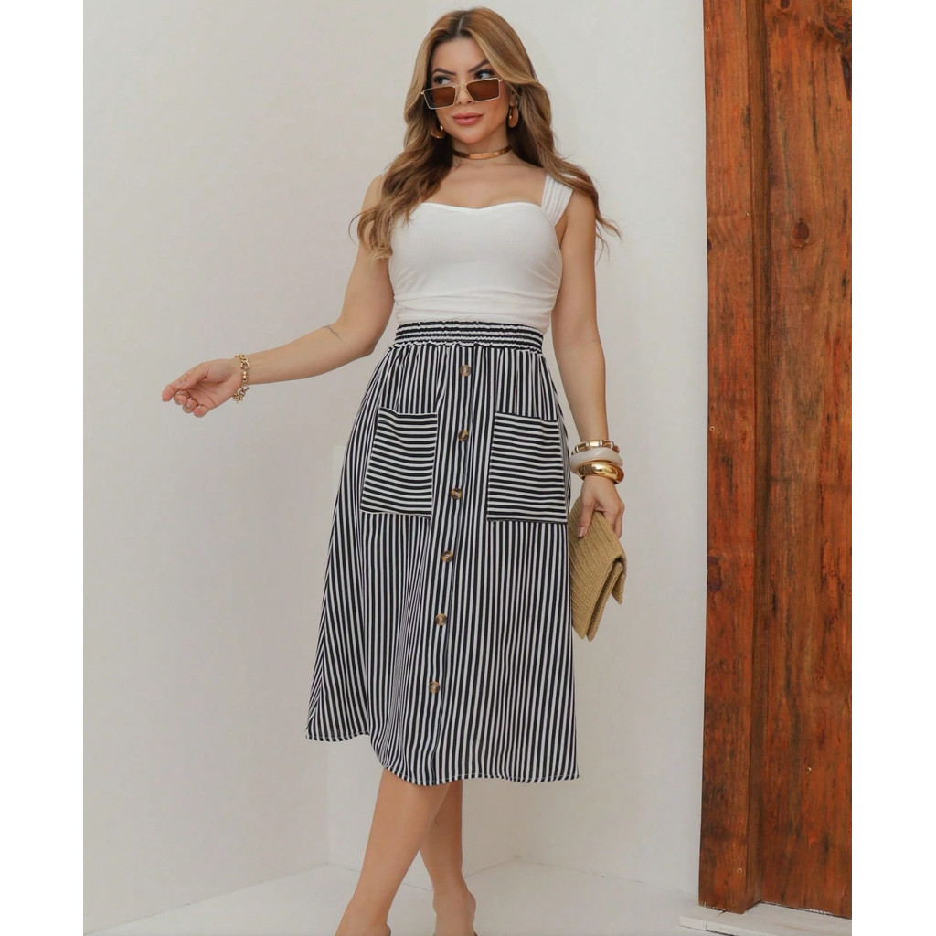 Saia Midi Com Bolsas Botãos E Forro Em Duna Listrado Moda