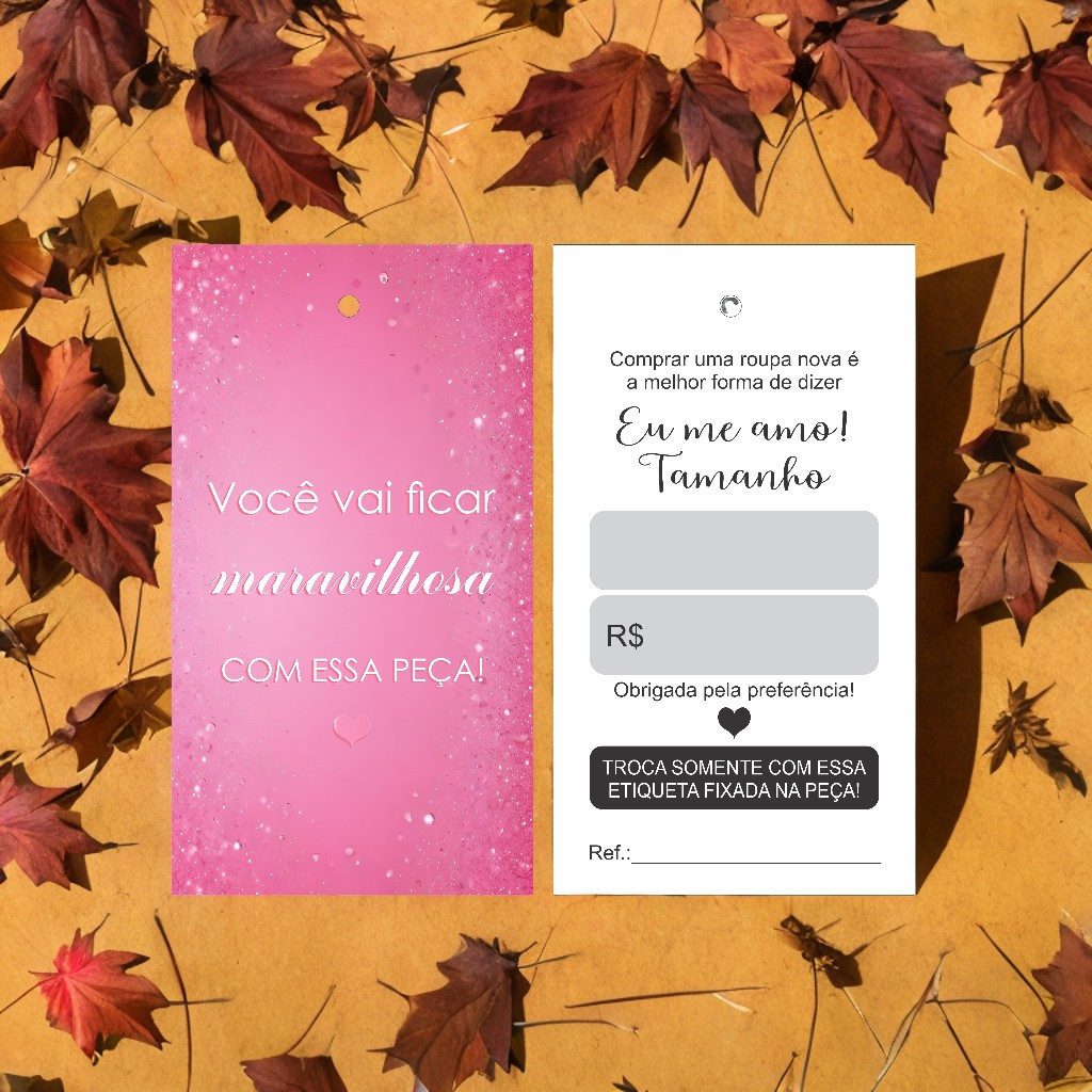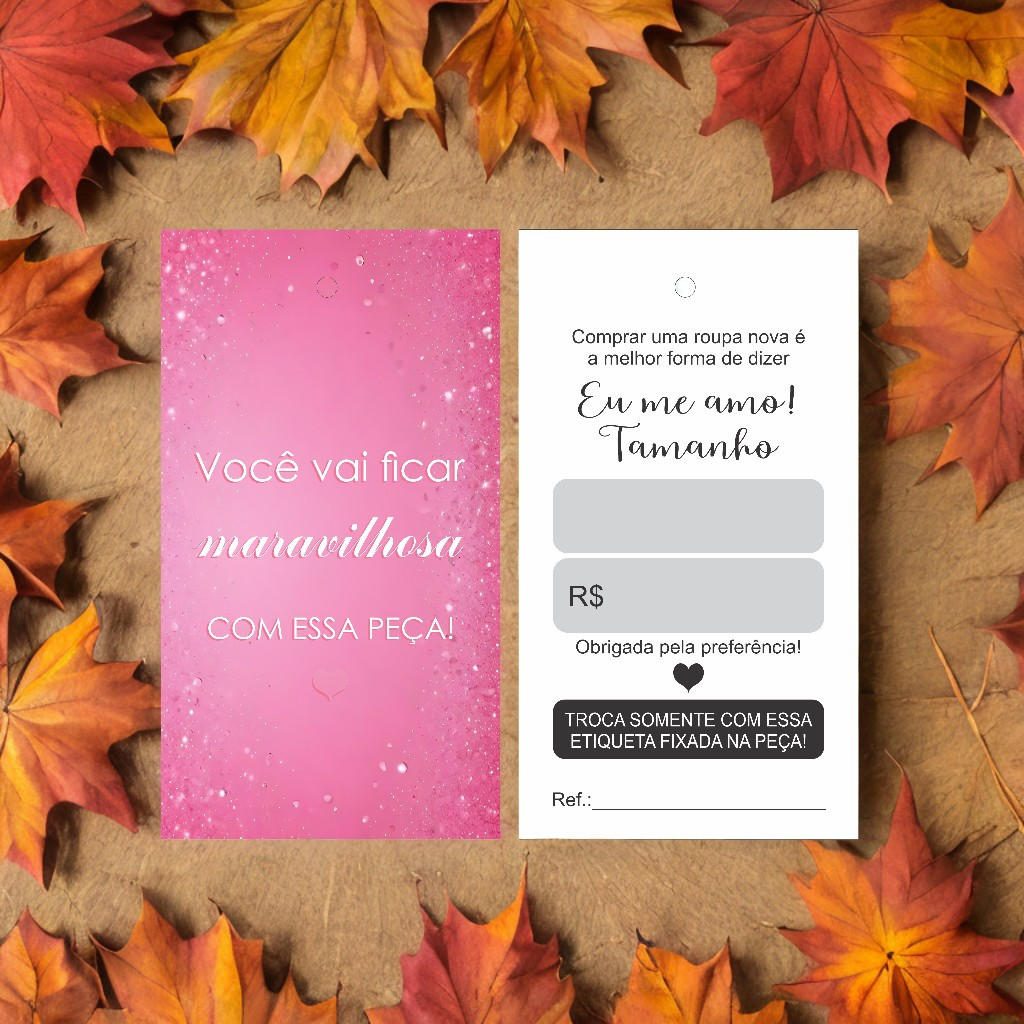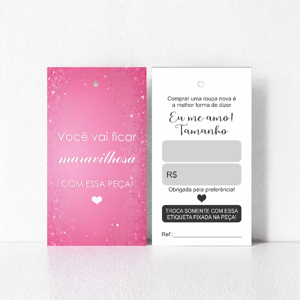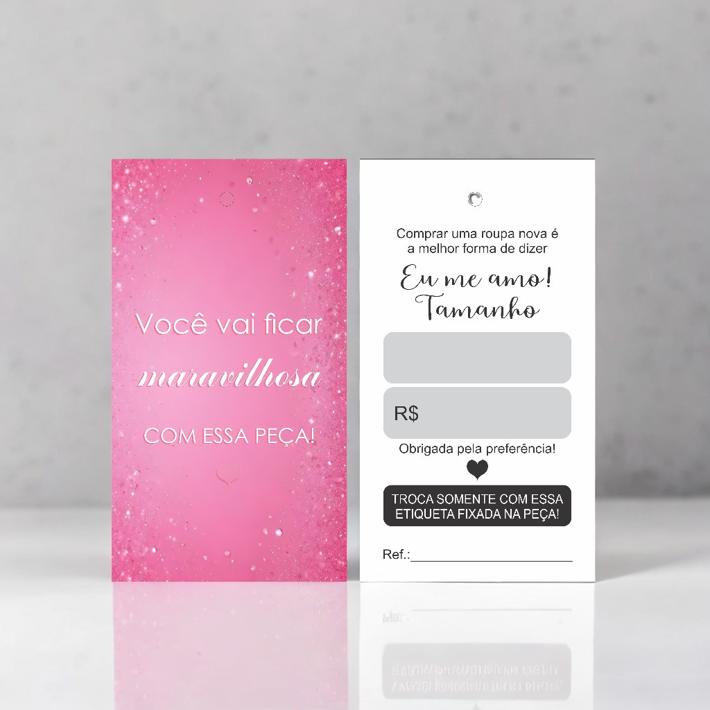 100 Tags Etiquetas para Roupas - Couché 250g - 4x1 - Verniz UV frente - Furo 3mm - Pronta Entrega