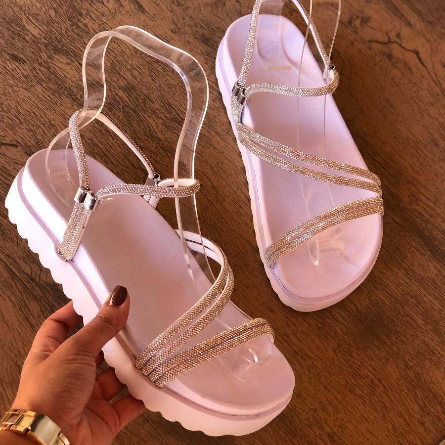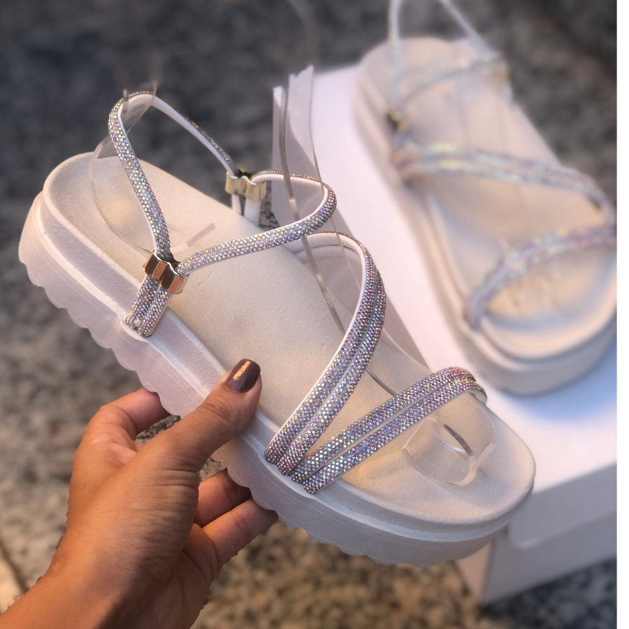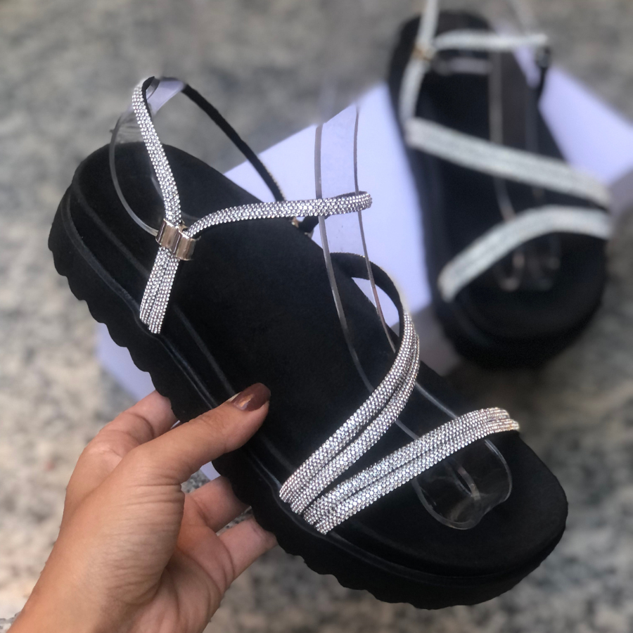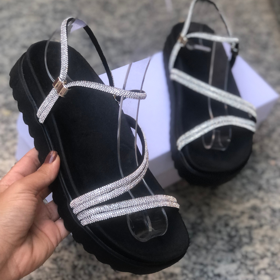 Papete Sandália Feminina Birken Anabela Salto Tratorada Stras Brilhante Branca Furta Cor Preta Festa