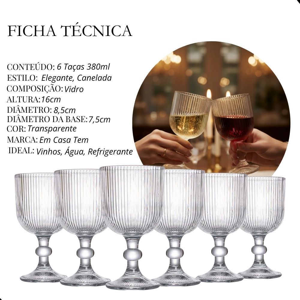 Jogo 6 Taças 380ml Kit Vidro Premium para Vinho, Drinks e Mesa Posta Sofisticada Luxo