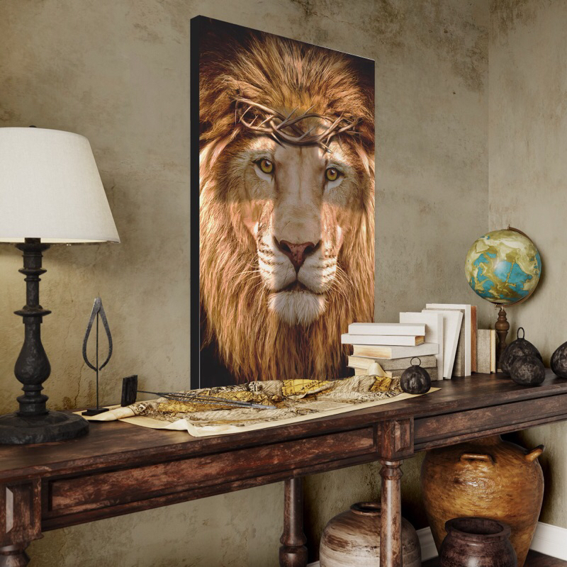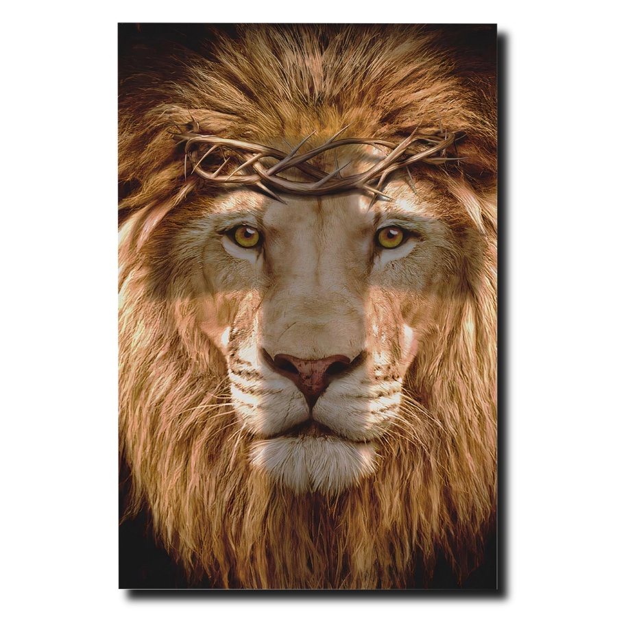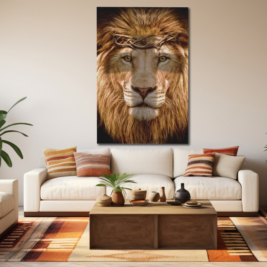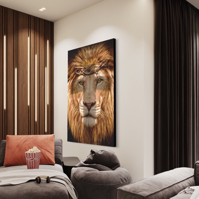 Quadro Decorativo Para Sala Leão Grande com Coroa de Espinhos e Cruz em TelaAcetinada