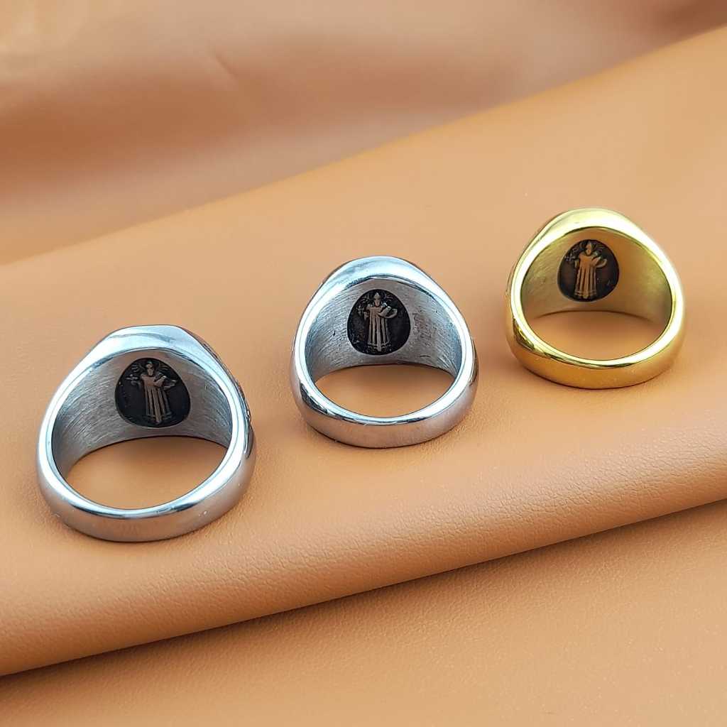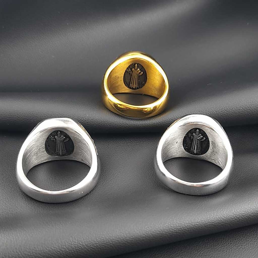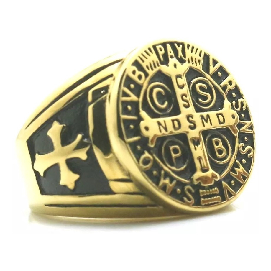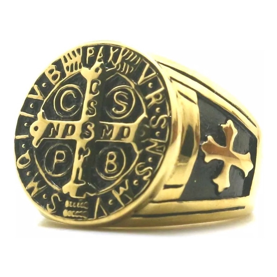 Anel São Bento Dourado banhado a ouro 18k Cruz Sagrada Aço inox maciço NÃO DESBOTA