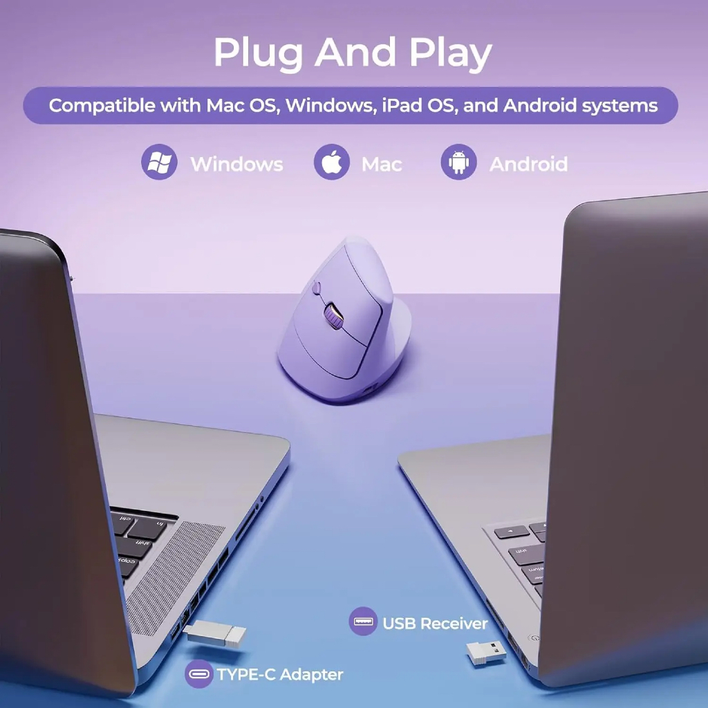 Mouse Vertical Ergonômico Seenda - Recarregável Sem Fio, USB Tipo C, com Receptor 2 em 1