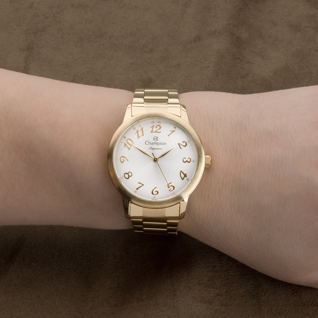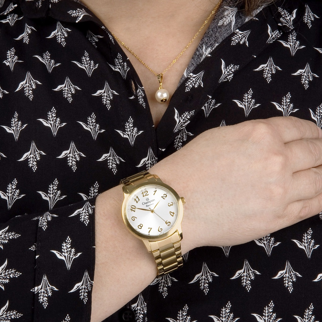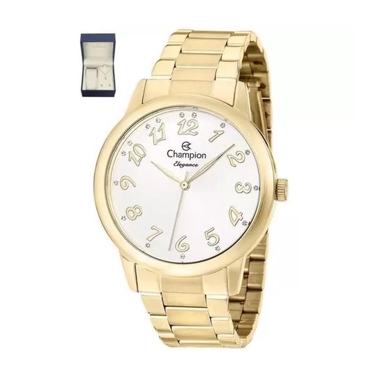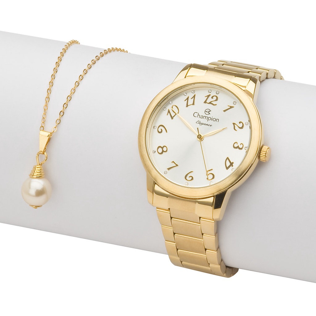 Relógio Champion Feminino Analógico Dourado + Kit Colar e Brincos Original À Prova d'Água Presente Moda Aniversário