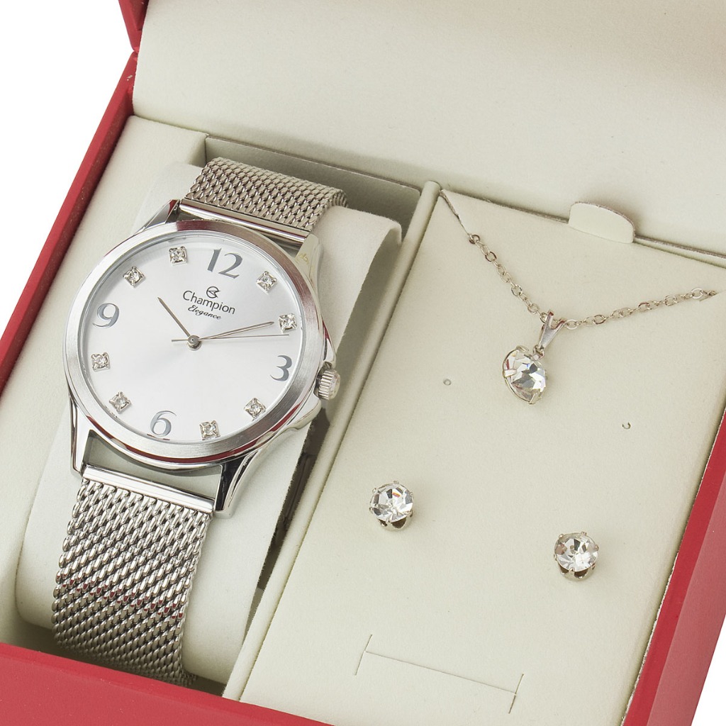 Relogio Feminino Prata Champion Kit Colar e Brincos CN24093Y