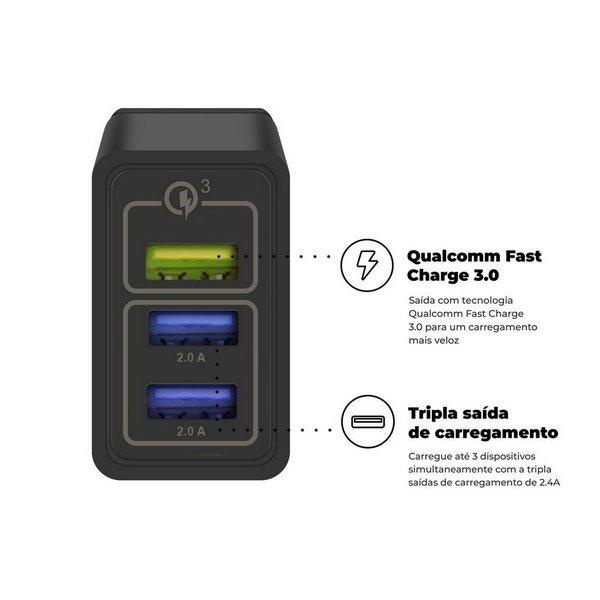 Carregador De Parede Turbo 3.0 Carga Rápida Com 3 Entradas Usb Bivolt - Preto - Gshield