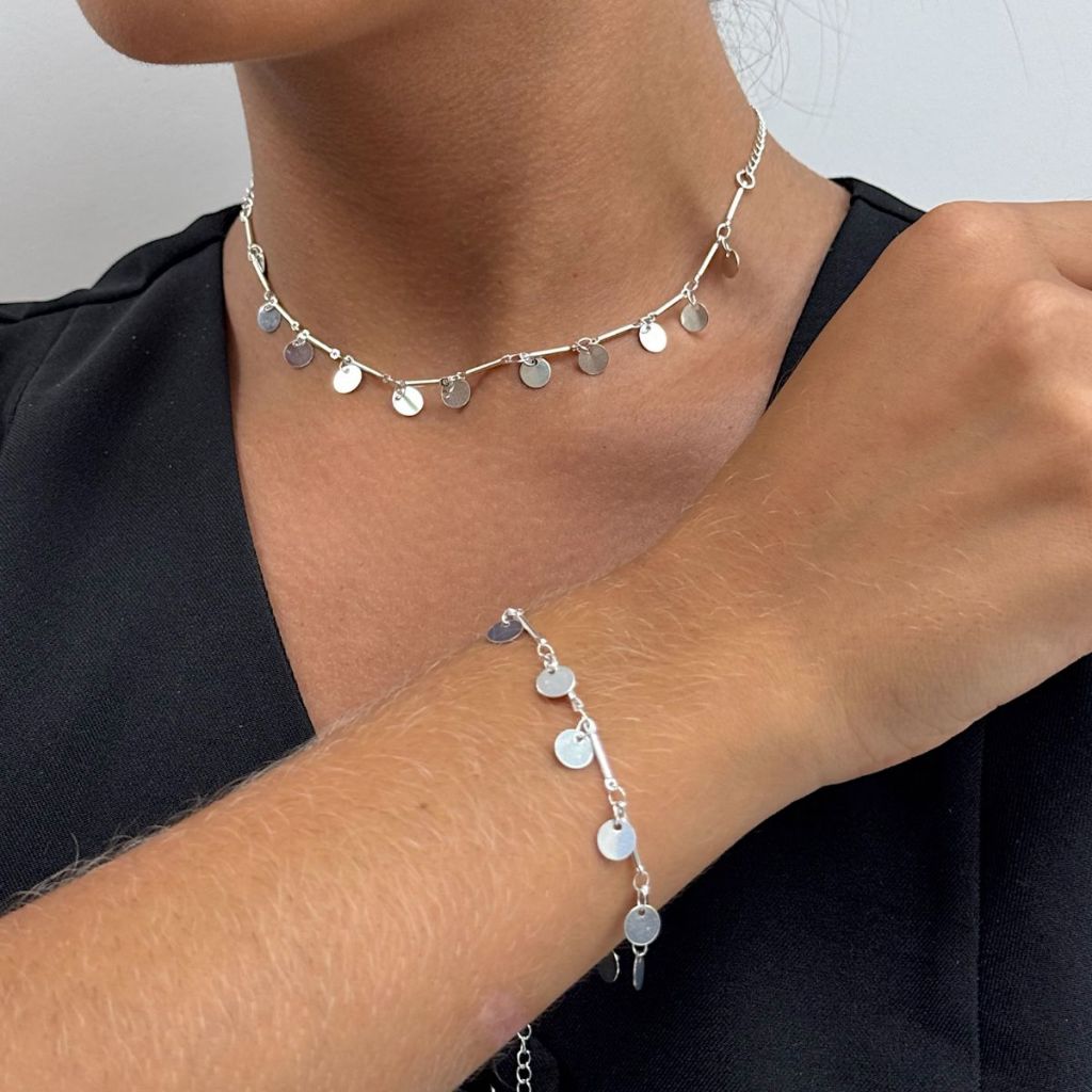 Colar e pulseira Mini Medalhas Bolinha Banhado a Prata