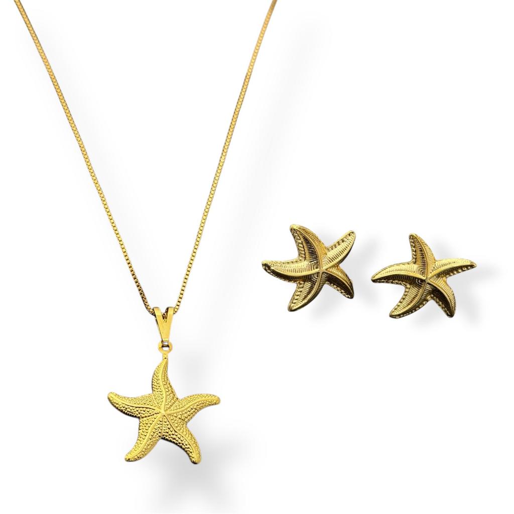 Conjunto Colar e Brinco Estrela Mar Moda Praia Banhado a Ouro