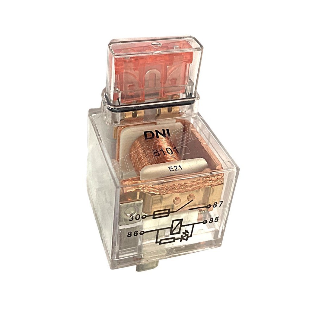 Relé Auxiliar Acrílico com LED 4 Terminais Fusível 40A 12V Base Selada Com Suporte DNI 8101
