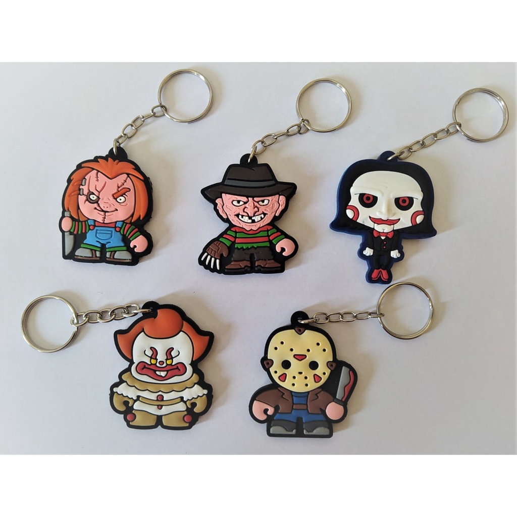 kit com 5 Chaveiros Emborrachados Coleção Halloween Freddy Krueger/It A Coisa/Jason Voorhees/Jigsaw/Chucky