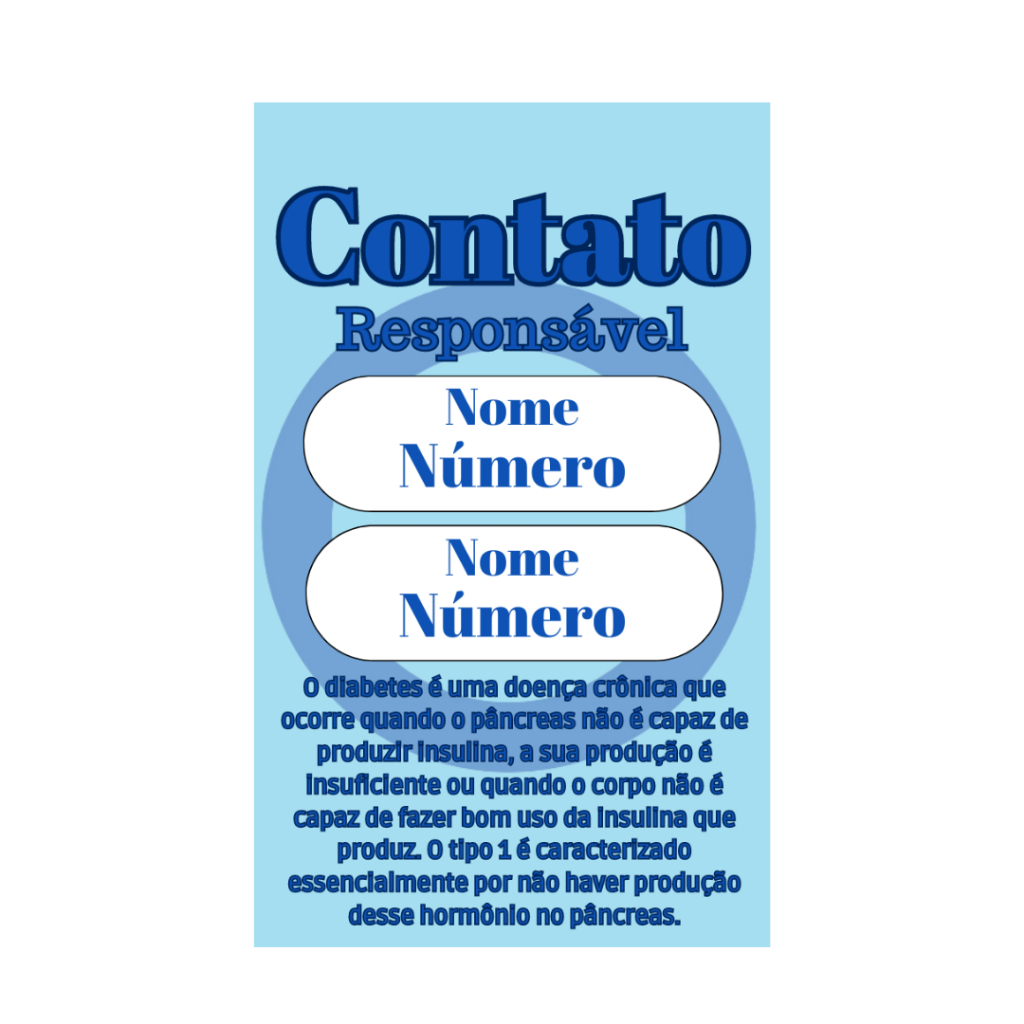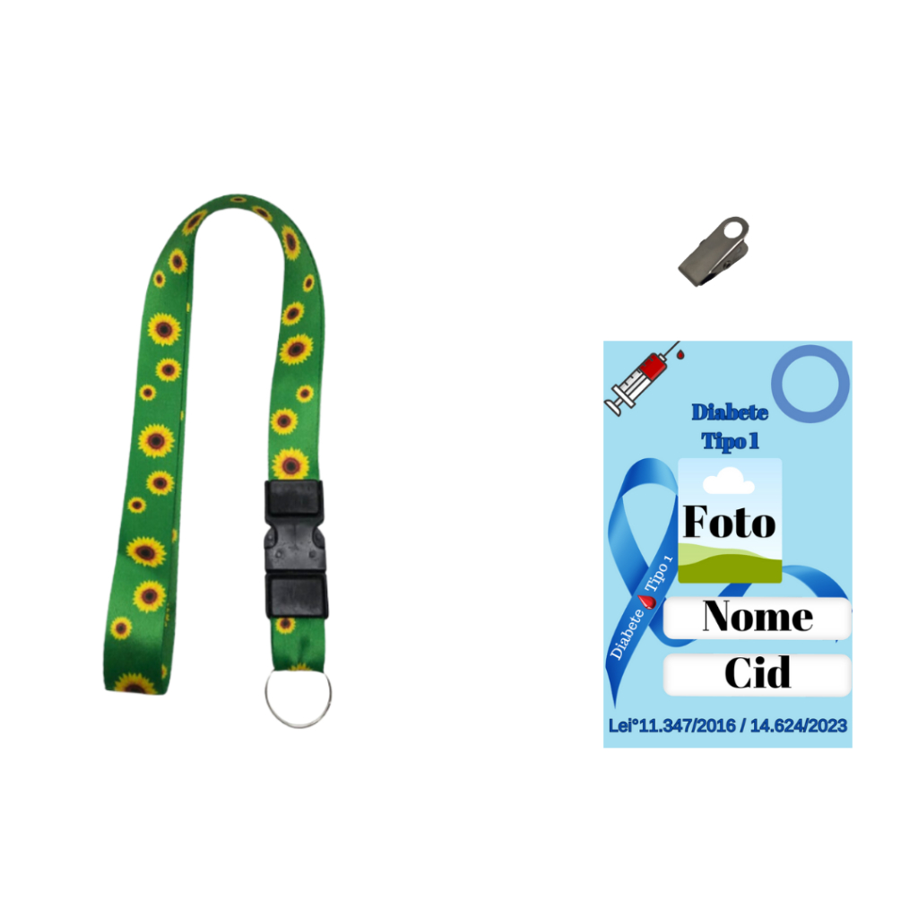Kit Cartão Crachá Polímero Identificação Personalizado Diabetes Tipo 1+Cordão Fecho Engate Rápido Girassol +Garra Jacaré