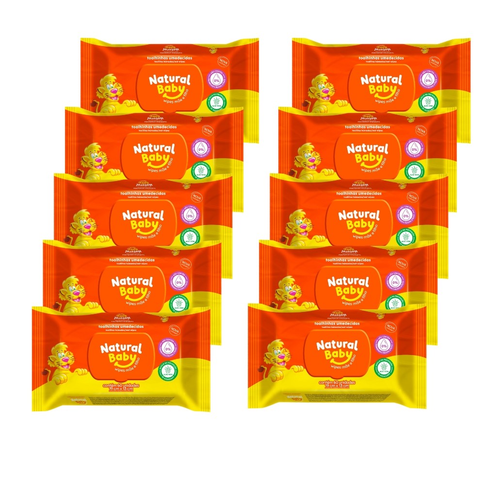 Kit c/10 Lenços Umedecidos Natural Baby 60un Cada Evergreen