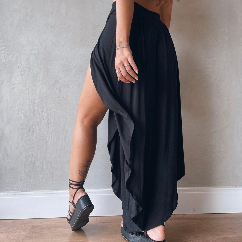 Saia Midi Fibra de Bambu com Abertura Lateral em V Cintura Média Feminina Lisa Verão