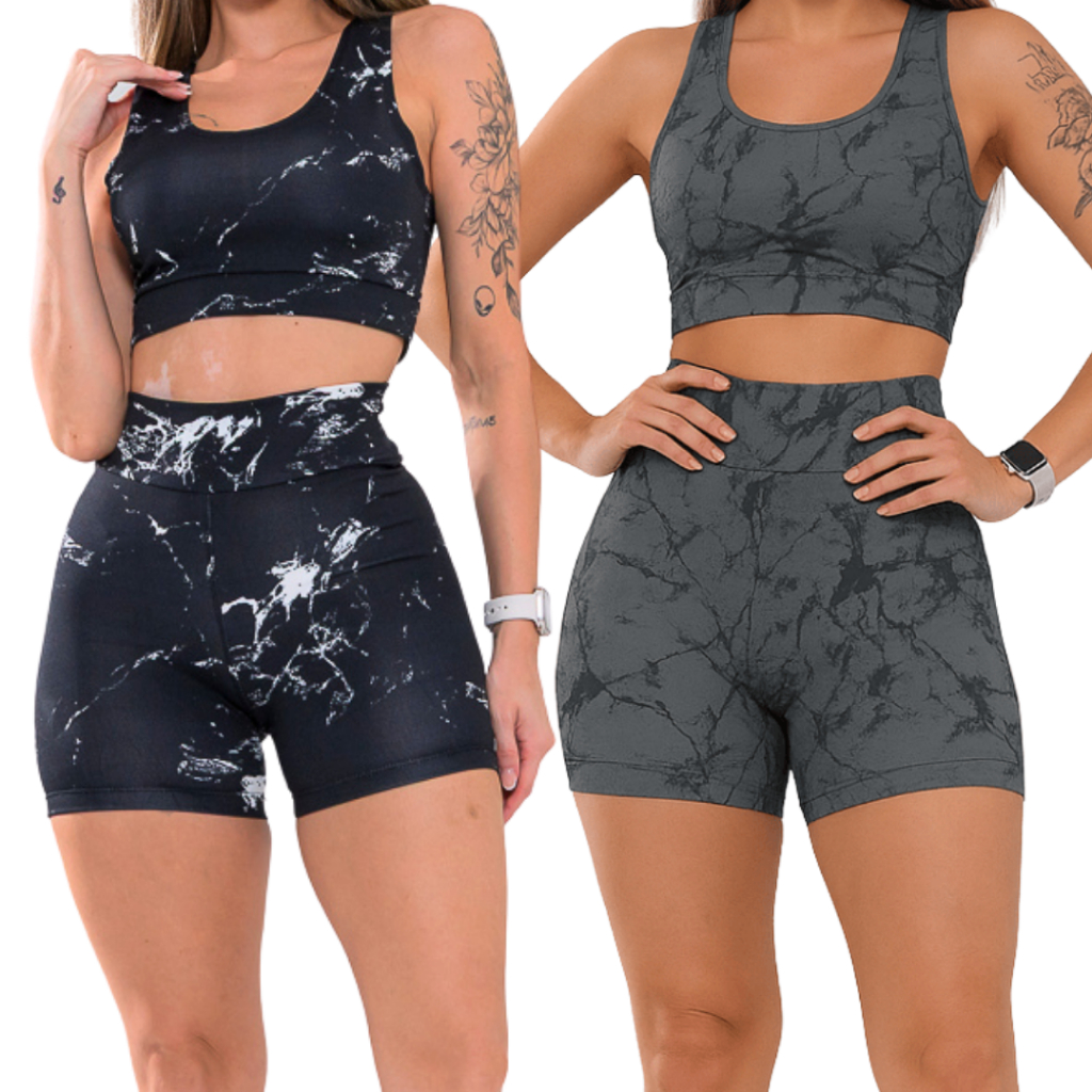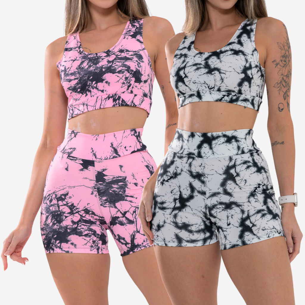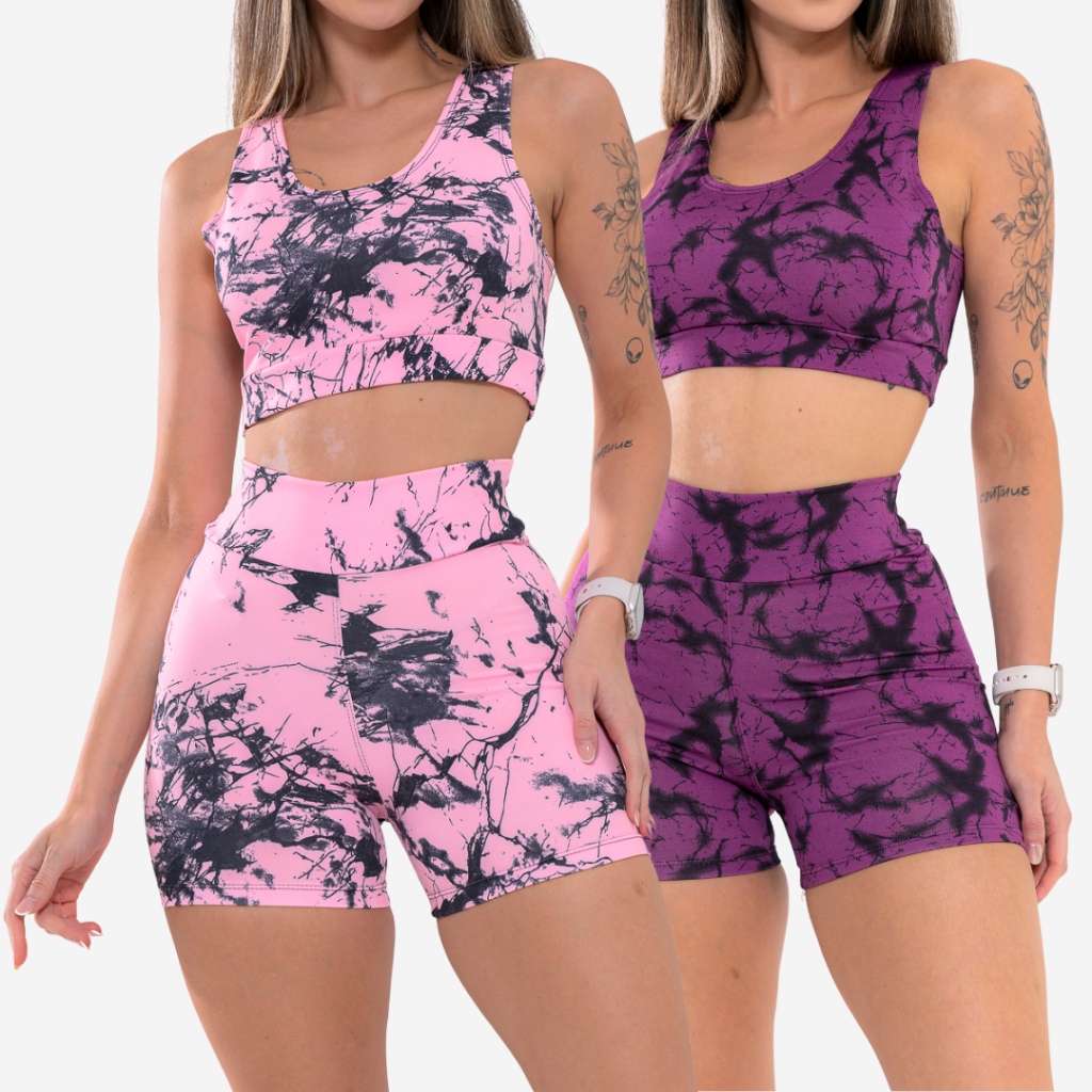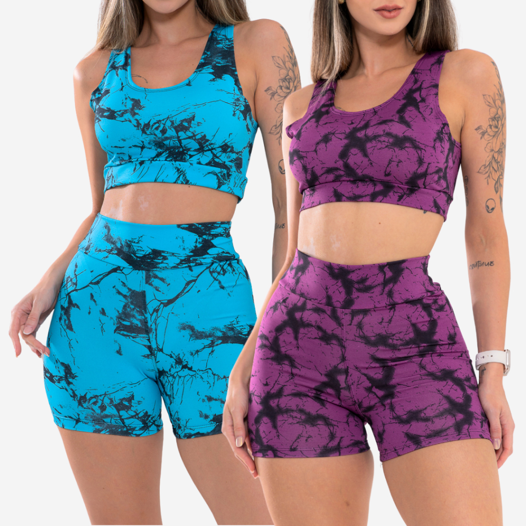 Kit 2 Conjunto Top e Short Marmorizado Tie Dye Academia Fitness Caminhada Ciclismo Ginastica