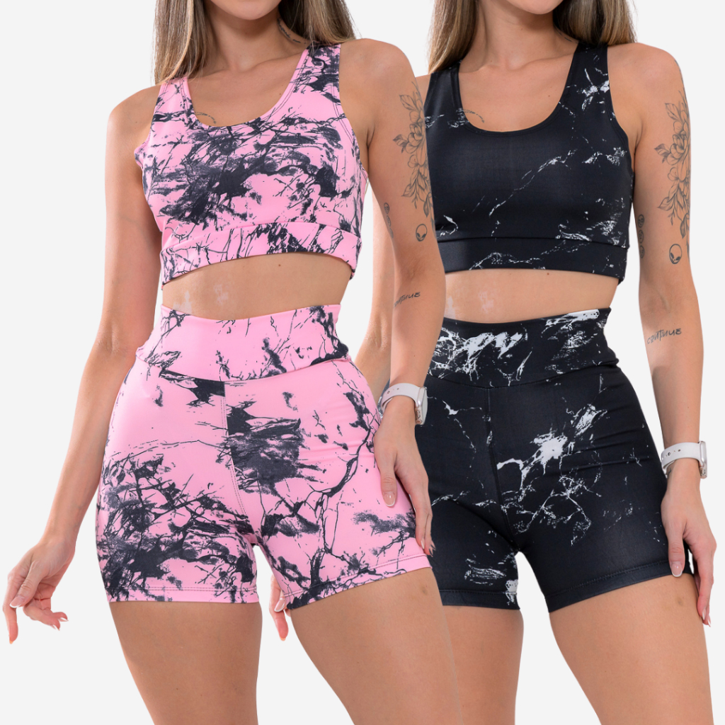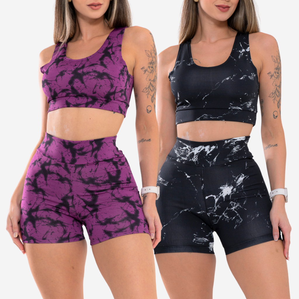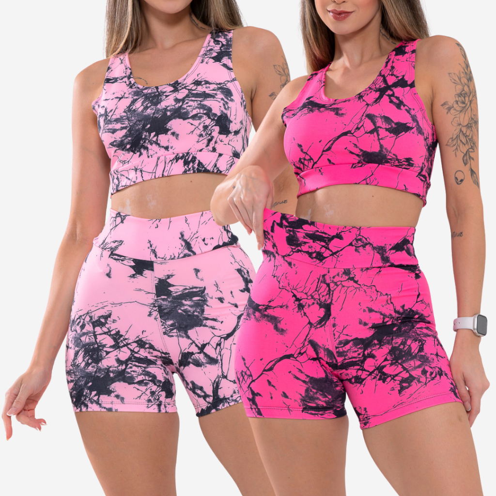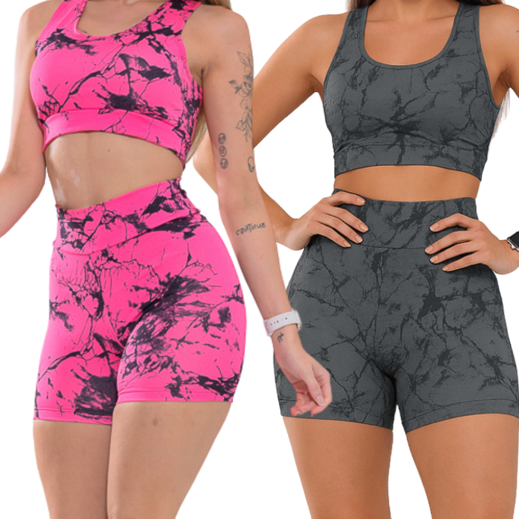 Kit 2 Conjunto Top e Short Marmorizado Tie Dye Academia Fitness Caminhada Ciclismo Ginastica