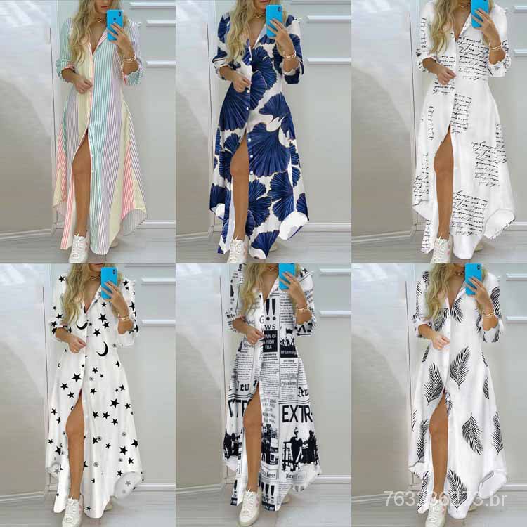 Vestido Longo Feminino Com Botão Solto Estampado Vestido Camisa