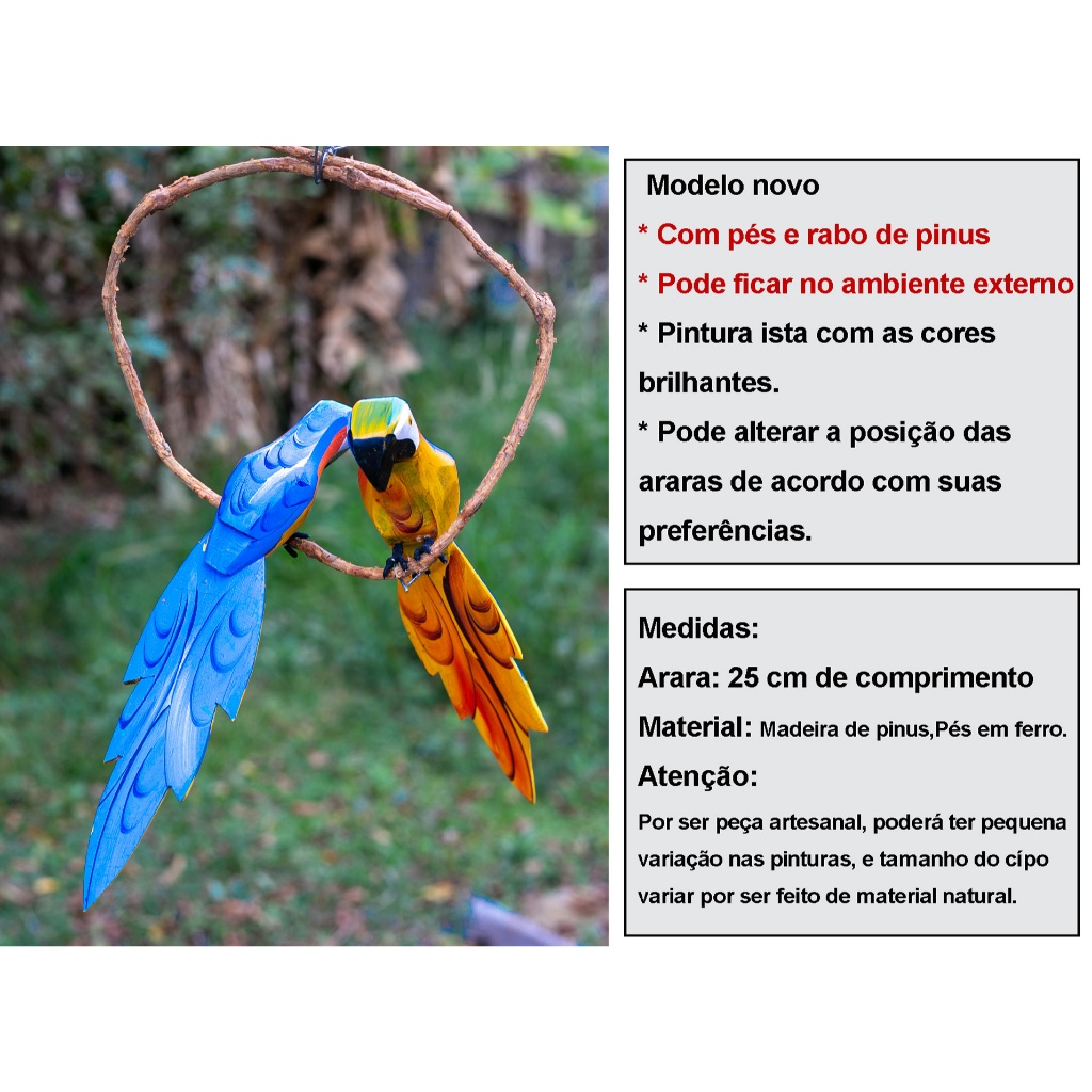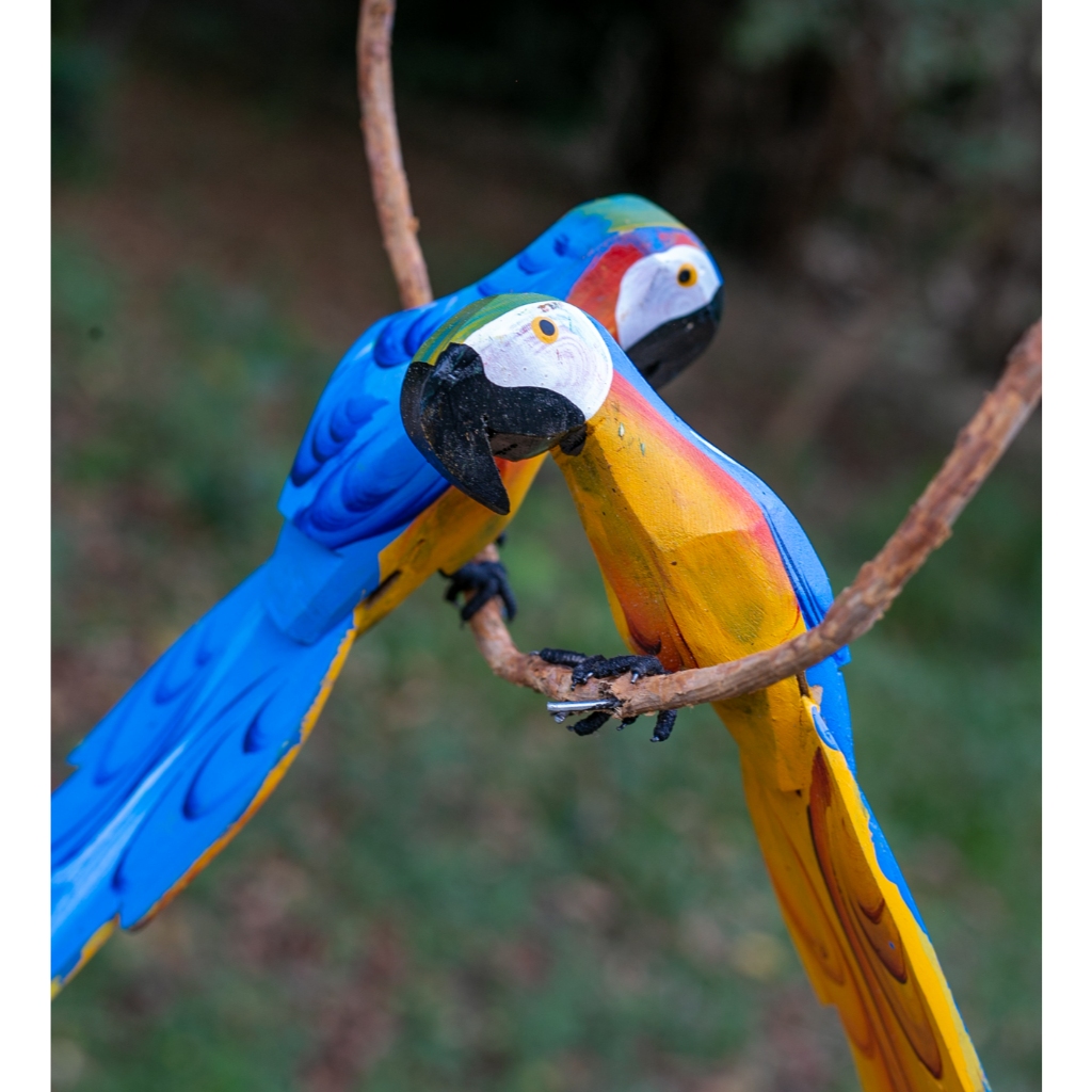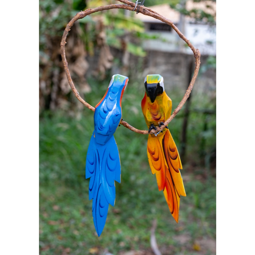 Escultura arara De Madeira Casal No Cipó Artesanal Rústico