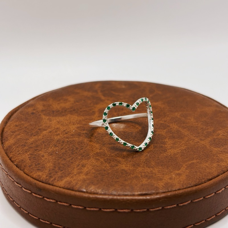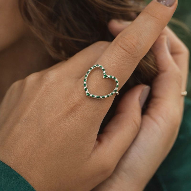 Anel Coração Vazado Cravejado Verde Esmeralda em Prata 925 Anel Feminino Romântico Elegante