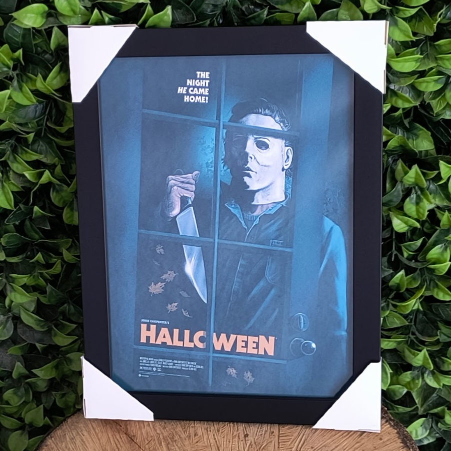 Quadro decorativo com moldura e vidro Halloween Michael Myers pôster terror geek