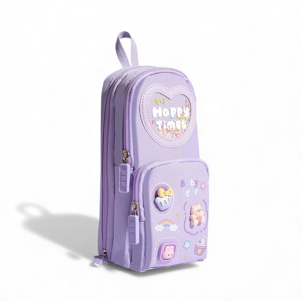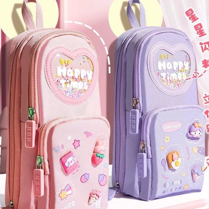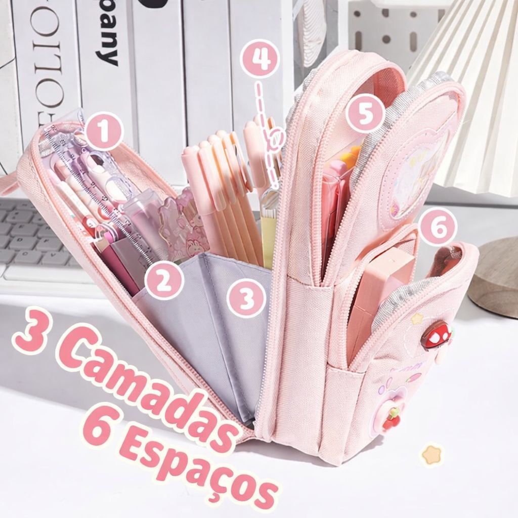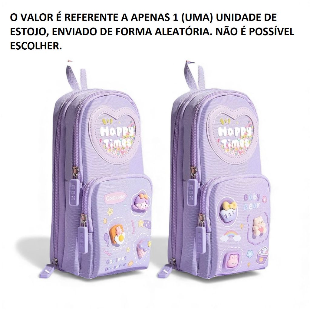 Estojo Escolar de Lápis de Tecido Com Apliques 3D Alto Relevo Com Três Divisórias Portátil Feminino
