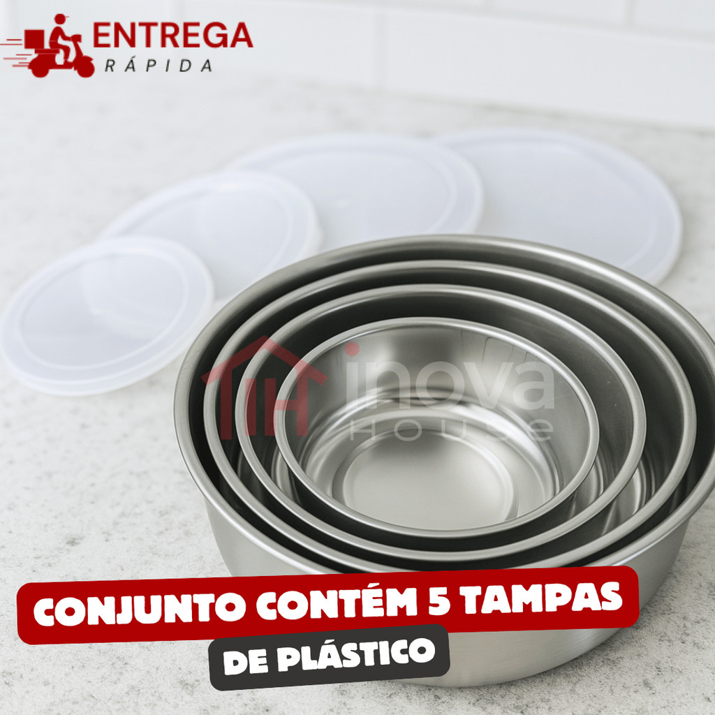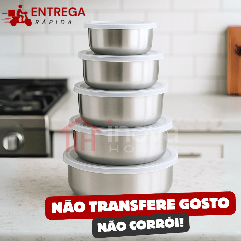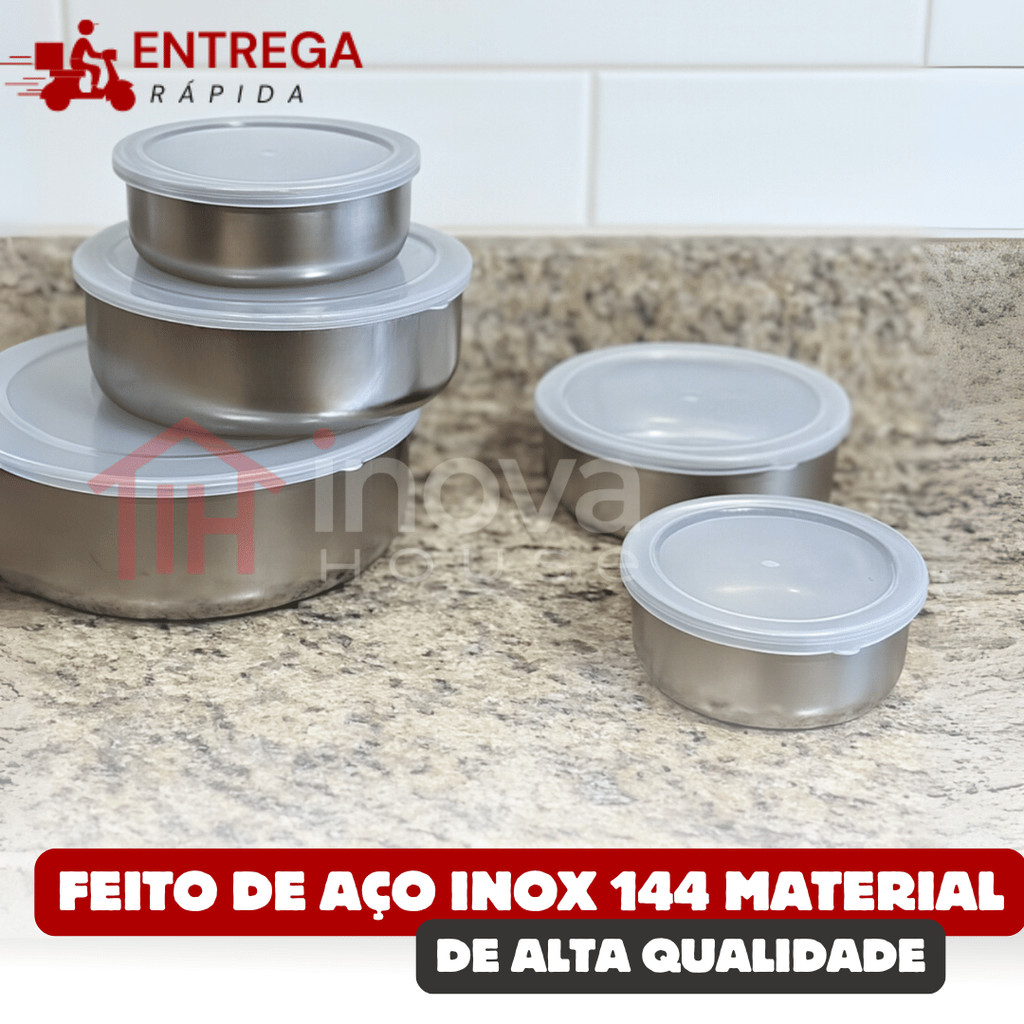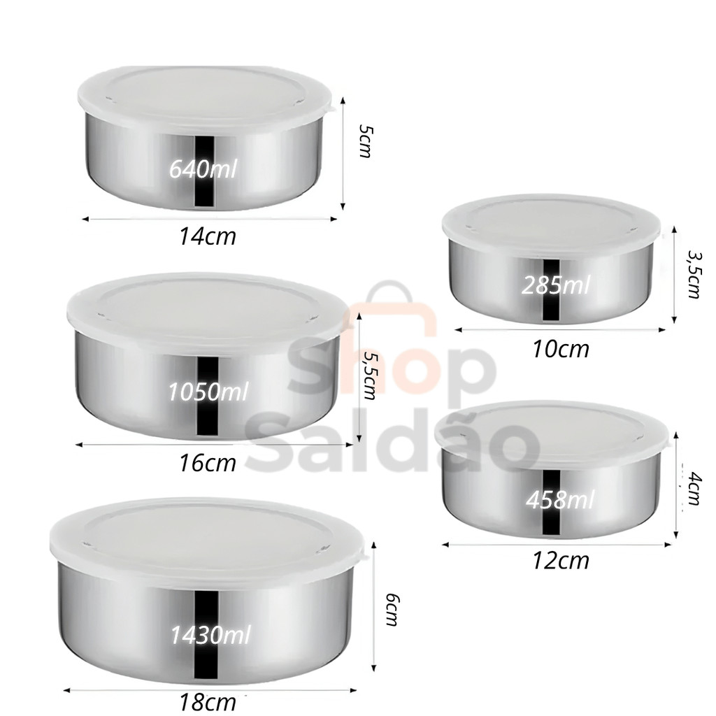 Jogo 5 Pote Tigela de Inox c/ Tampa Hermética Kit Organizadores Redondos para Cozinha 285ml a 1430ml