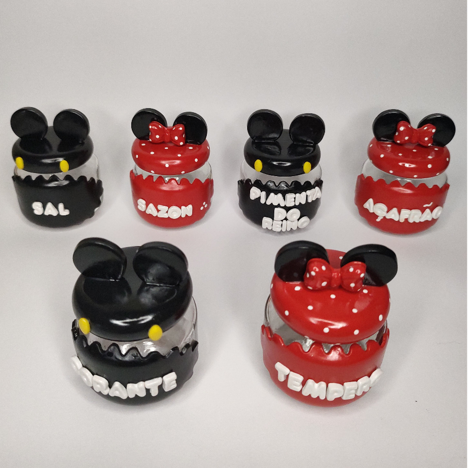 Kit Com 6 Potes De Vidro Personalizados Para armazenar Temperos-Decorado Em Biscuit Mickey-Minnie