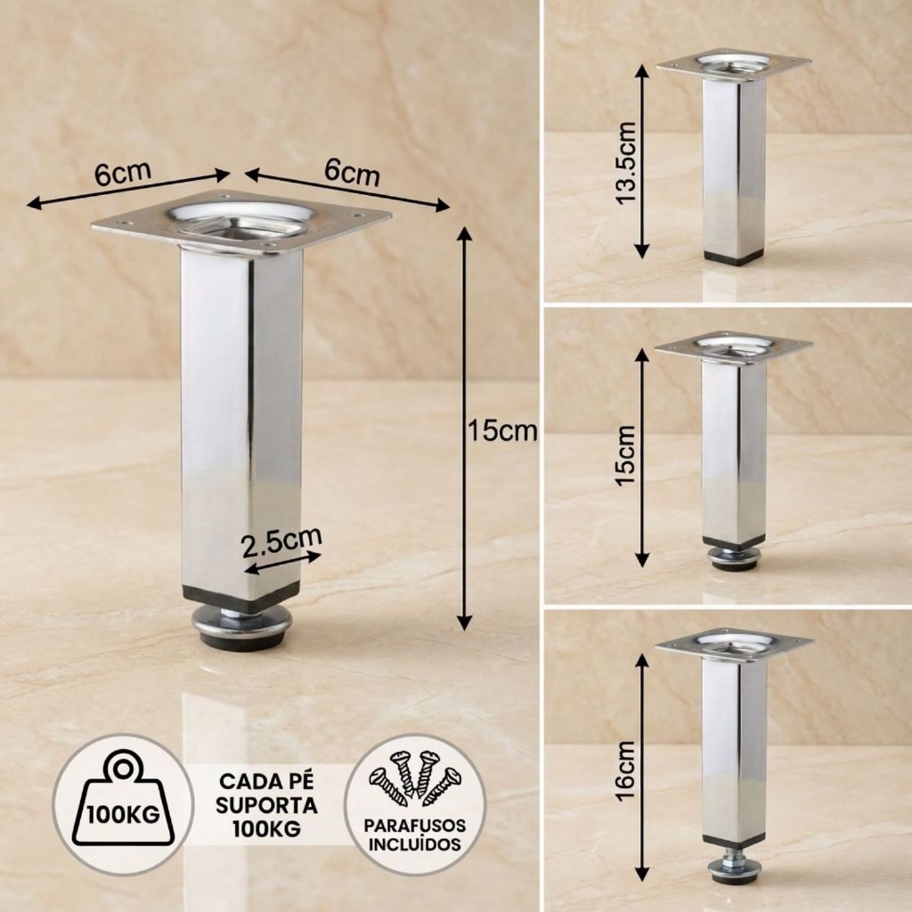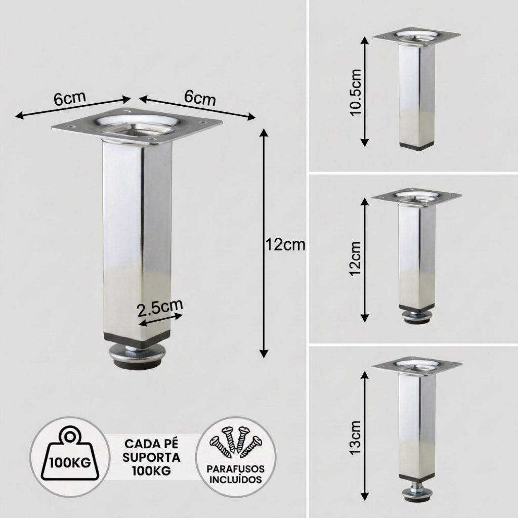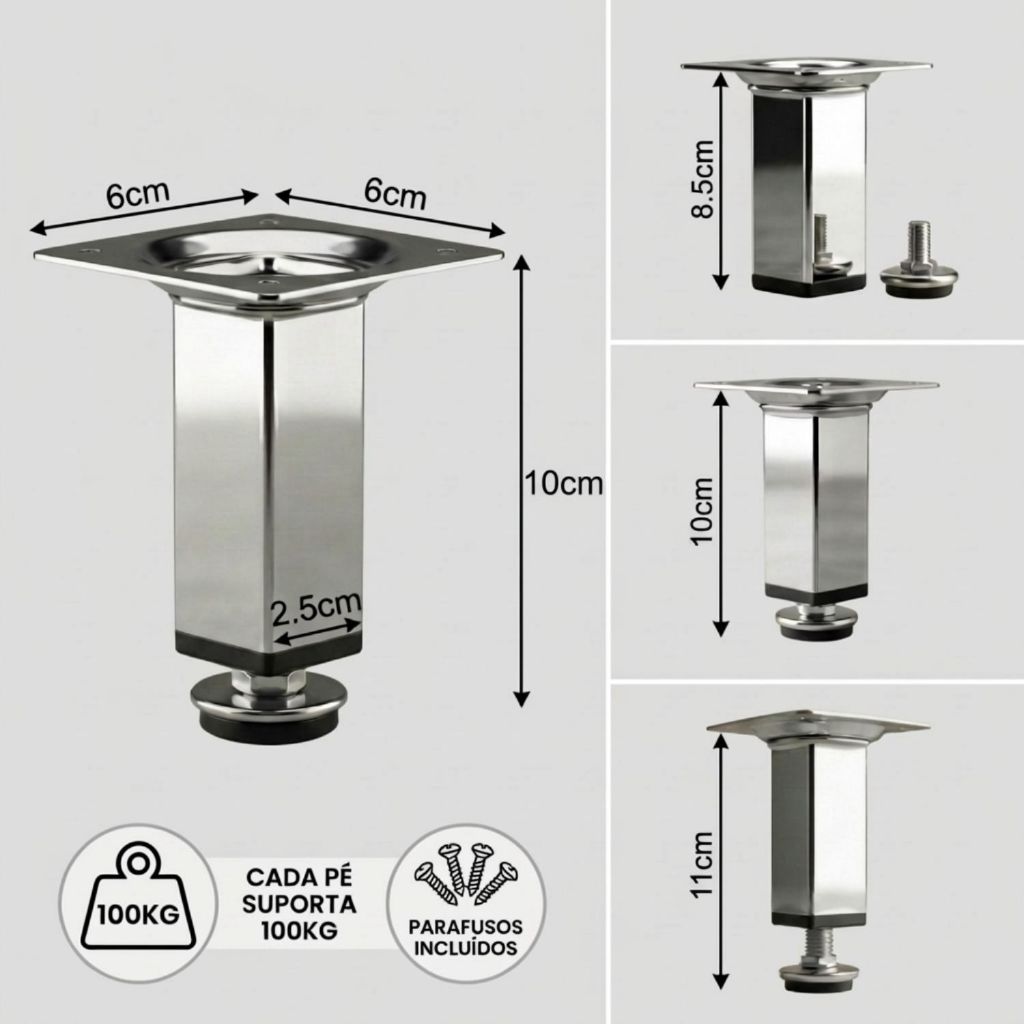 KIT 4 Pés Para Móveis 6cm, 8cm, 10cm, 12cm, 15cm, 20cm Regulável Quadrado Cromado