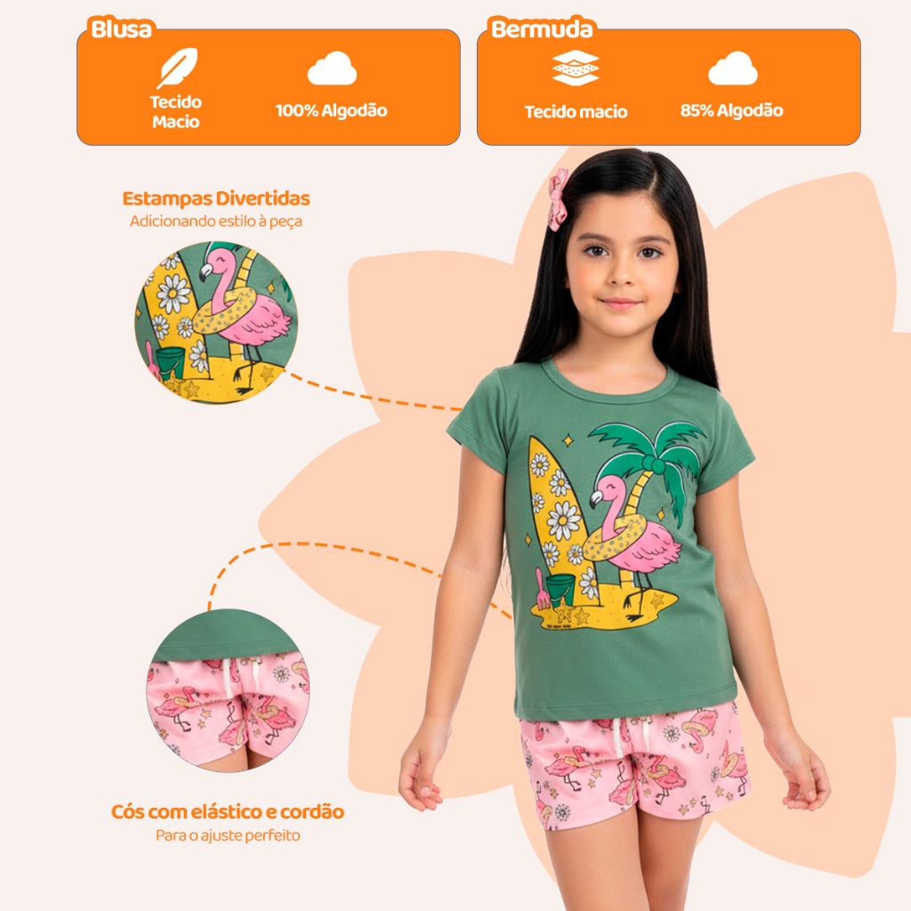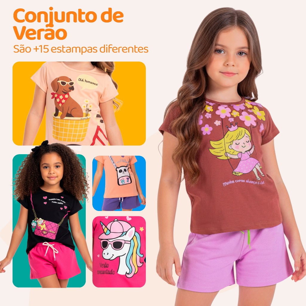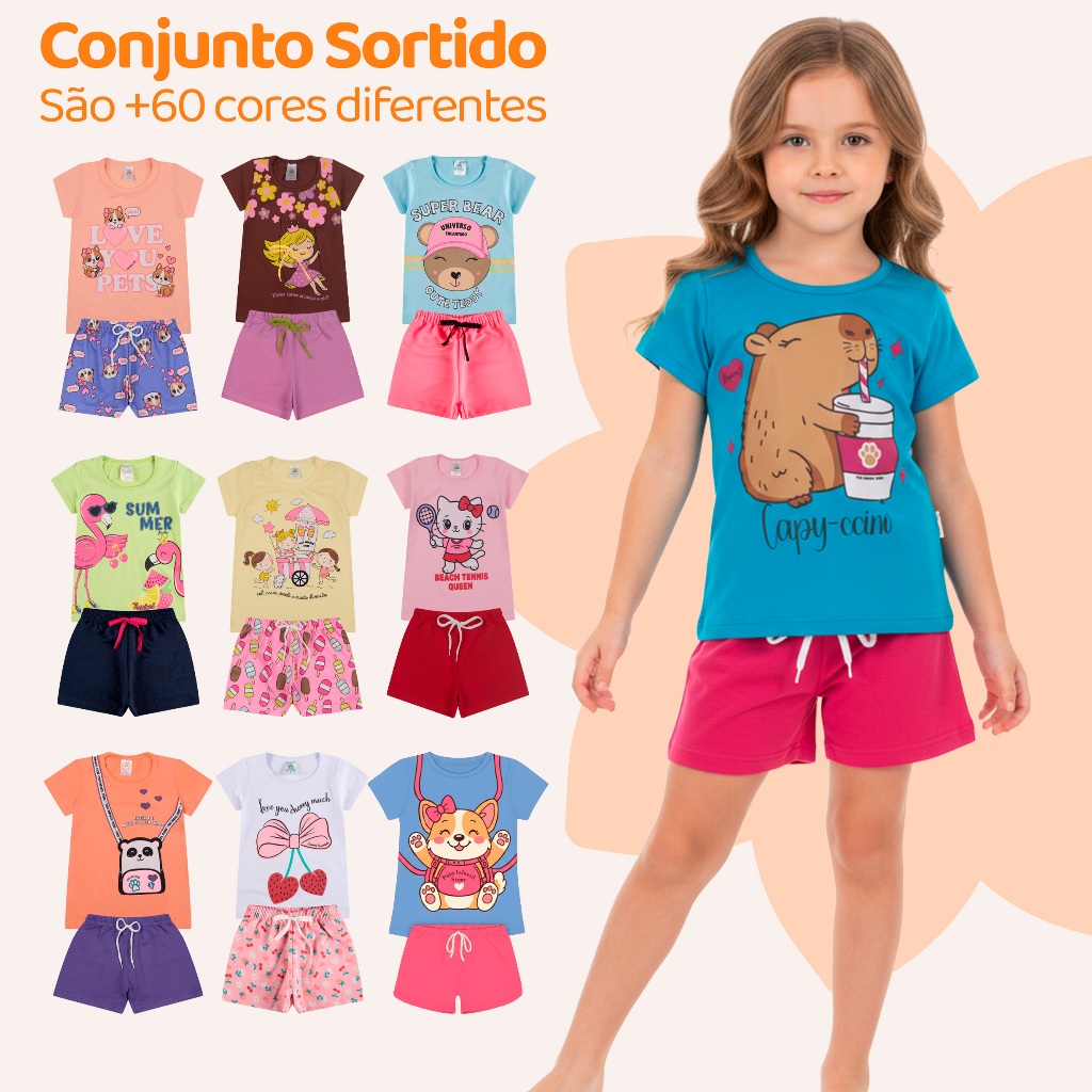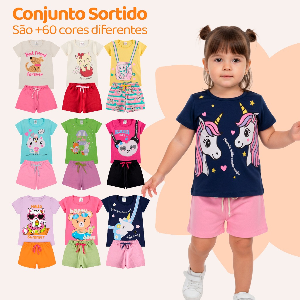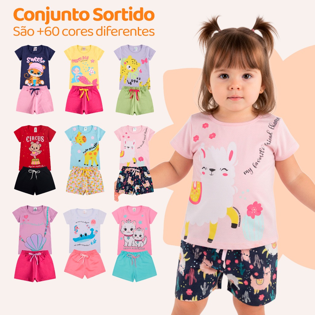 Kit Sortido 6 Peças de Roupas Infantil Menina 3 Camisetas + 3 Bermudas - Kit 3 Conjuntos Infantil Menina Verão Bebê