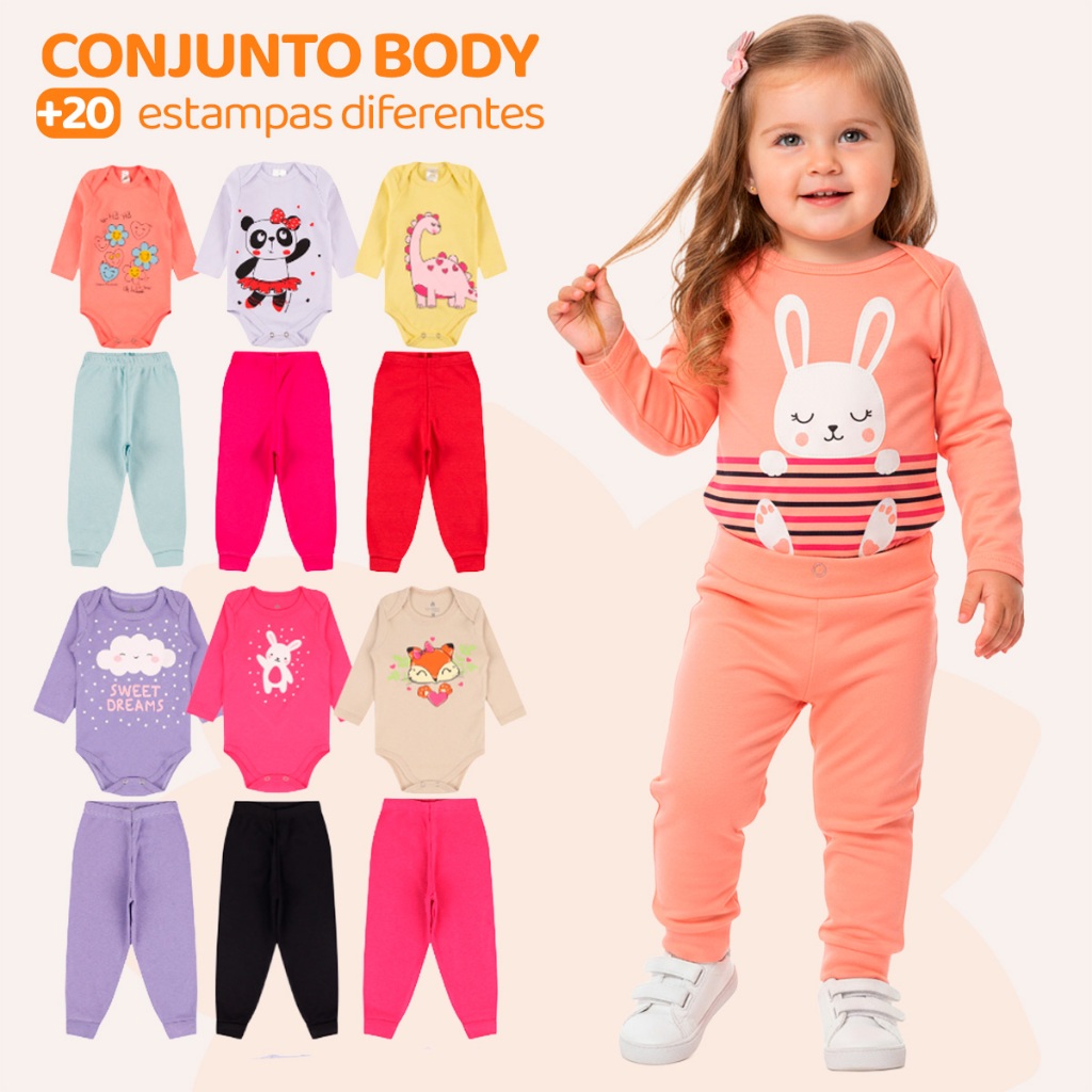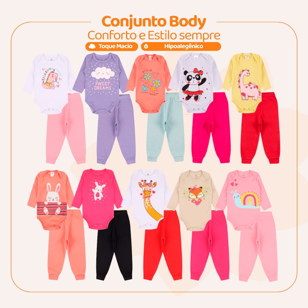 Kit 8 Peças de Roupas para Bebê Menina (4 Body Longo + 4 Calça Mijão)Kit 5 Conjunto Body + Calça Roupa Infantil Bebê
