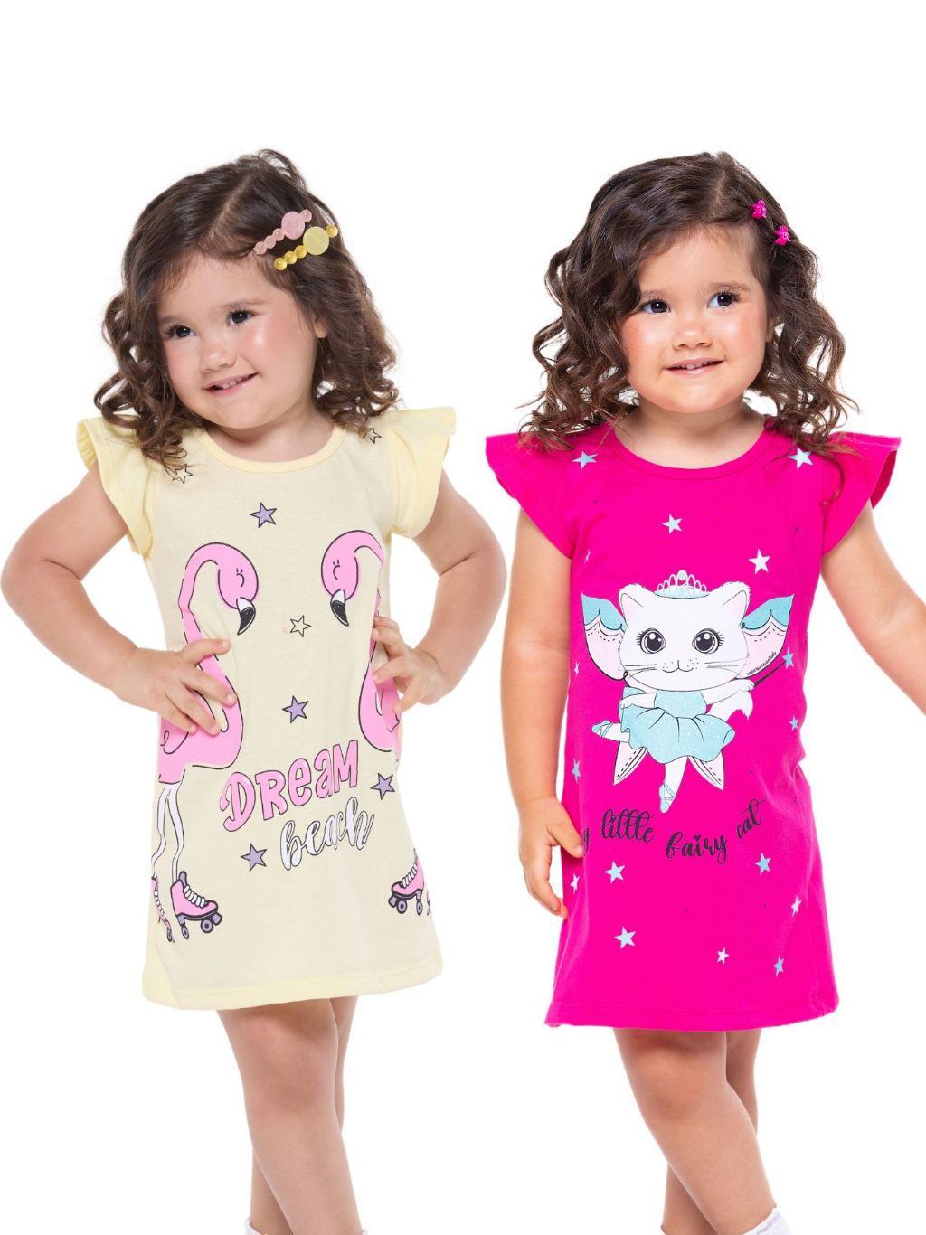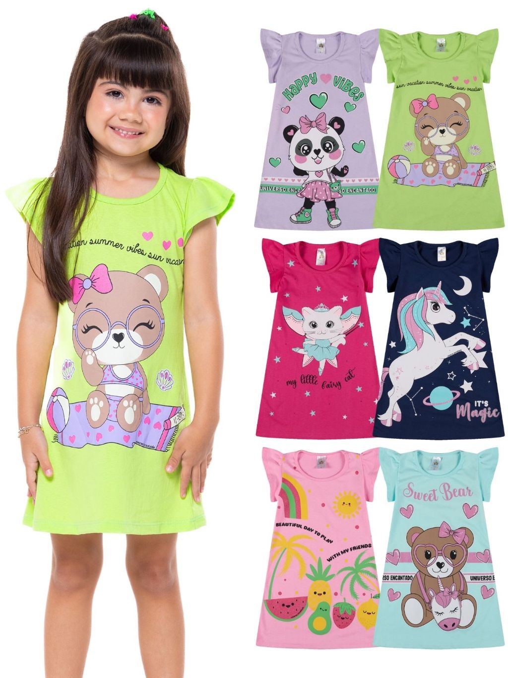 Kit 3 Vestido Infantil Menina Verão Estampados 100% Algodão com Mangas Franzidas - Kit Sortido Tamanhos 1 ao 10