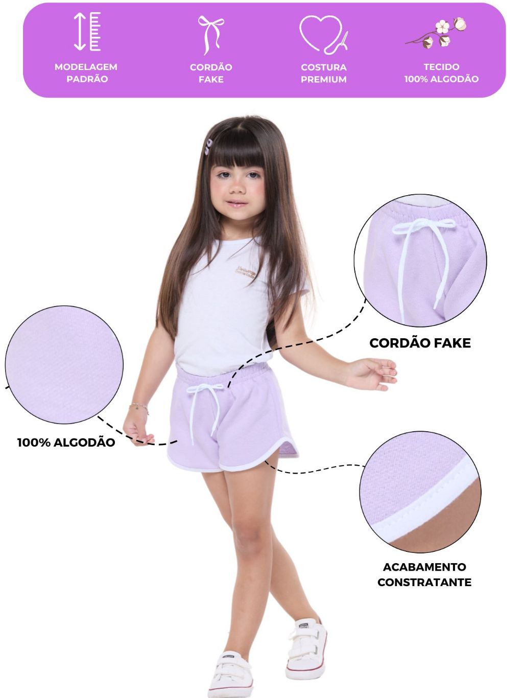 Kit 4 Shorts Infantil Menina Blogueira Moletinho 100% Algodão - Bermuda com Friso Contrastante - Kit Sortido 4 Bermudas