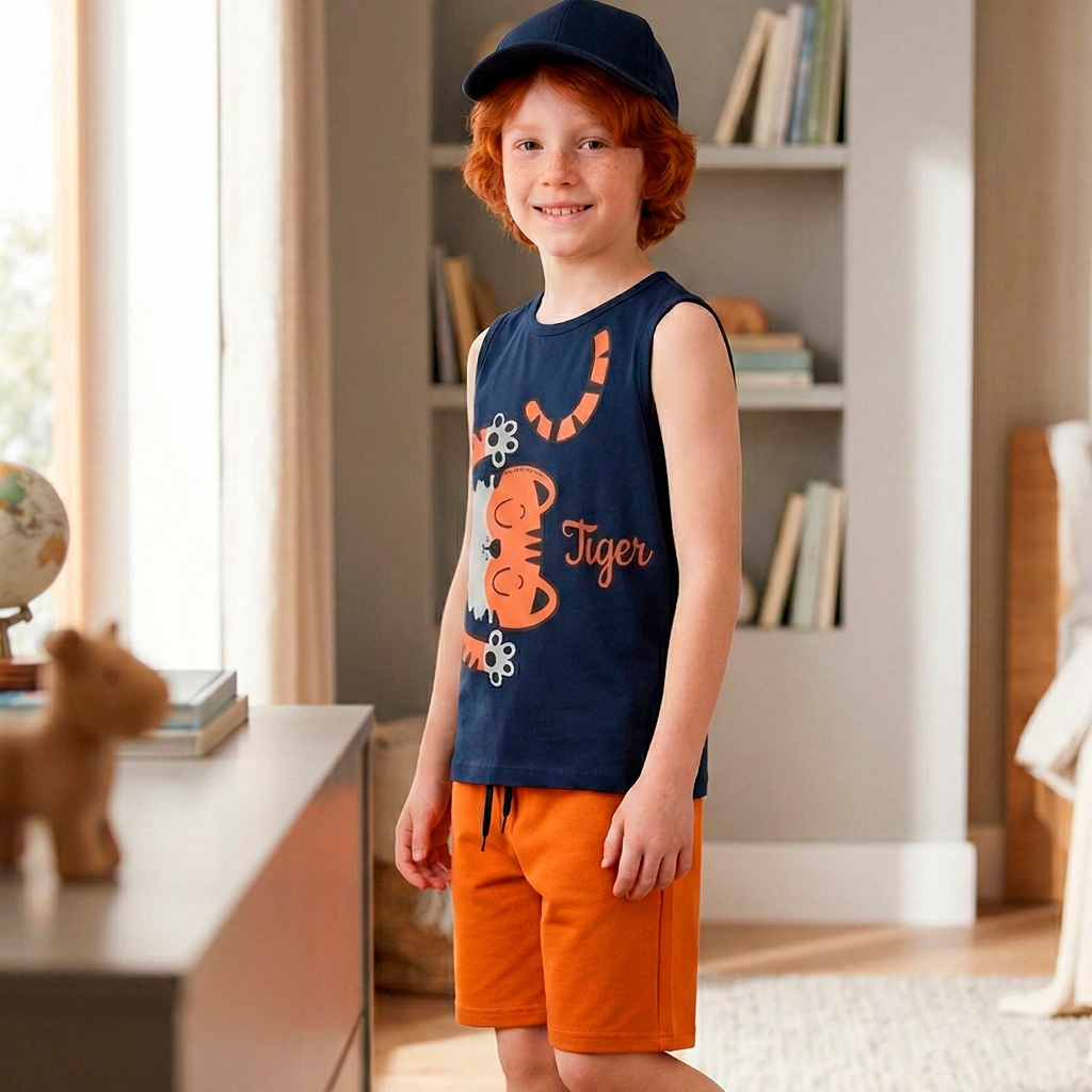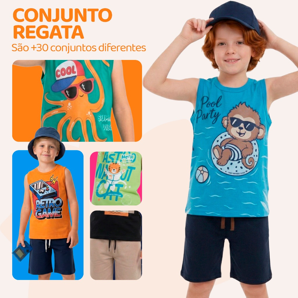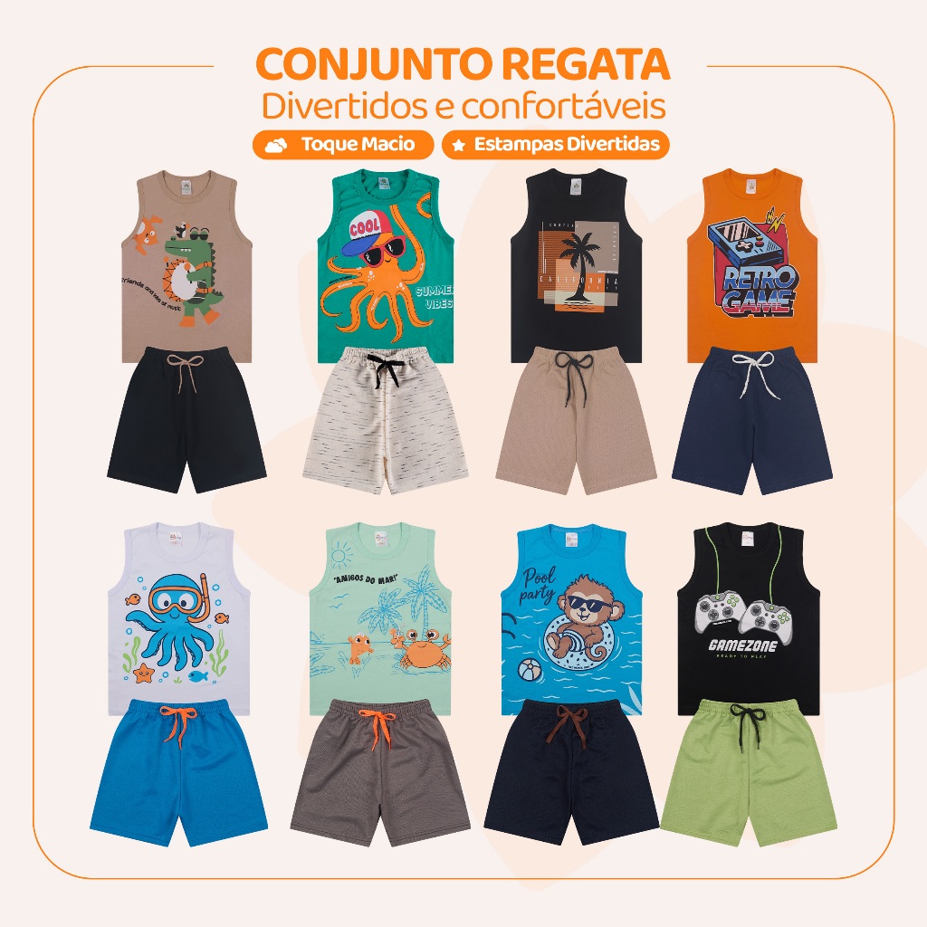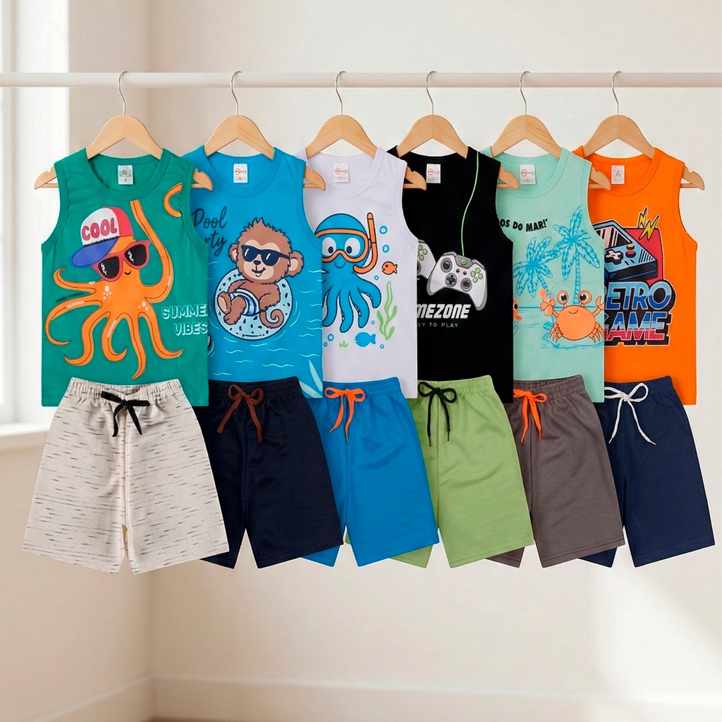 Kit 4 ou 8 Peças de Conjunto Regata para Meninos Infantil Masculino Roupa de Bebe Verão Estampado em Algodão para Calor