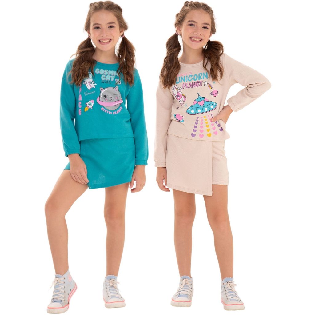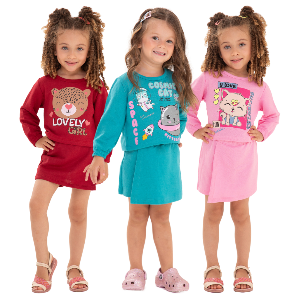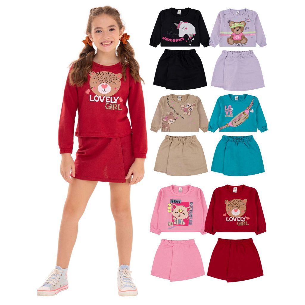 Kit Sortido 4 Peças Menina Short Saia e Cropped Moletinho 100% Algodão Tamanho 2 ao 10