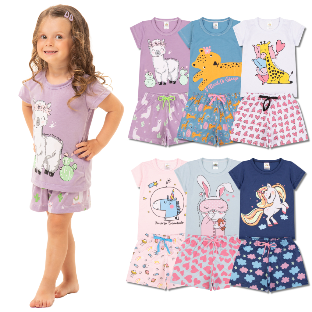 Kit Sortido 5 Pijama Infantil Menina - 5 Camisetas + 5 Bermudas - Kit com 5 Pijamas de Roupa Infantil Menina Verão Bebê
