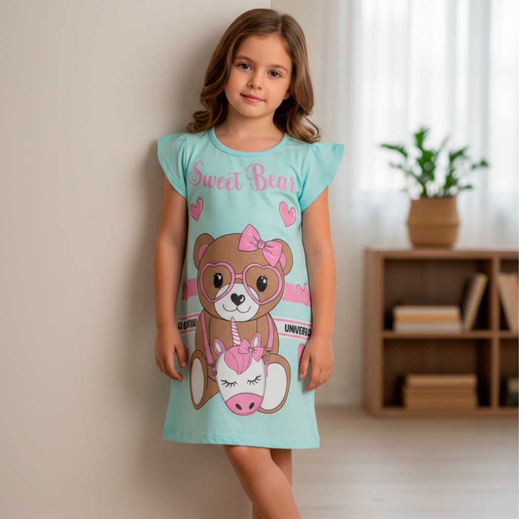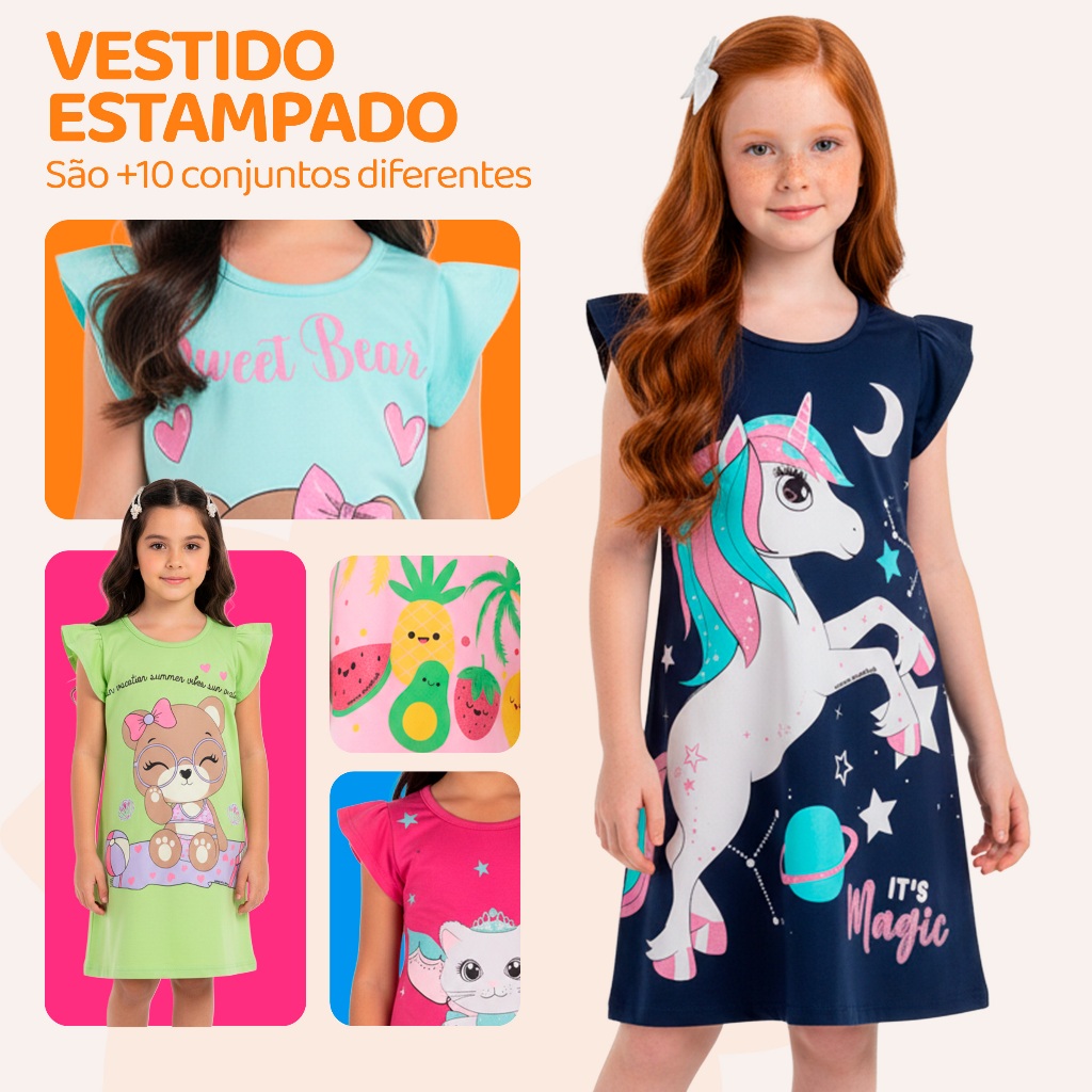 Kit 1, 2 ou 4 Vestido Infantil Menina Verão Feminino Estampados 100% Algodão com Mangas Franzidas