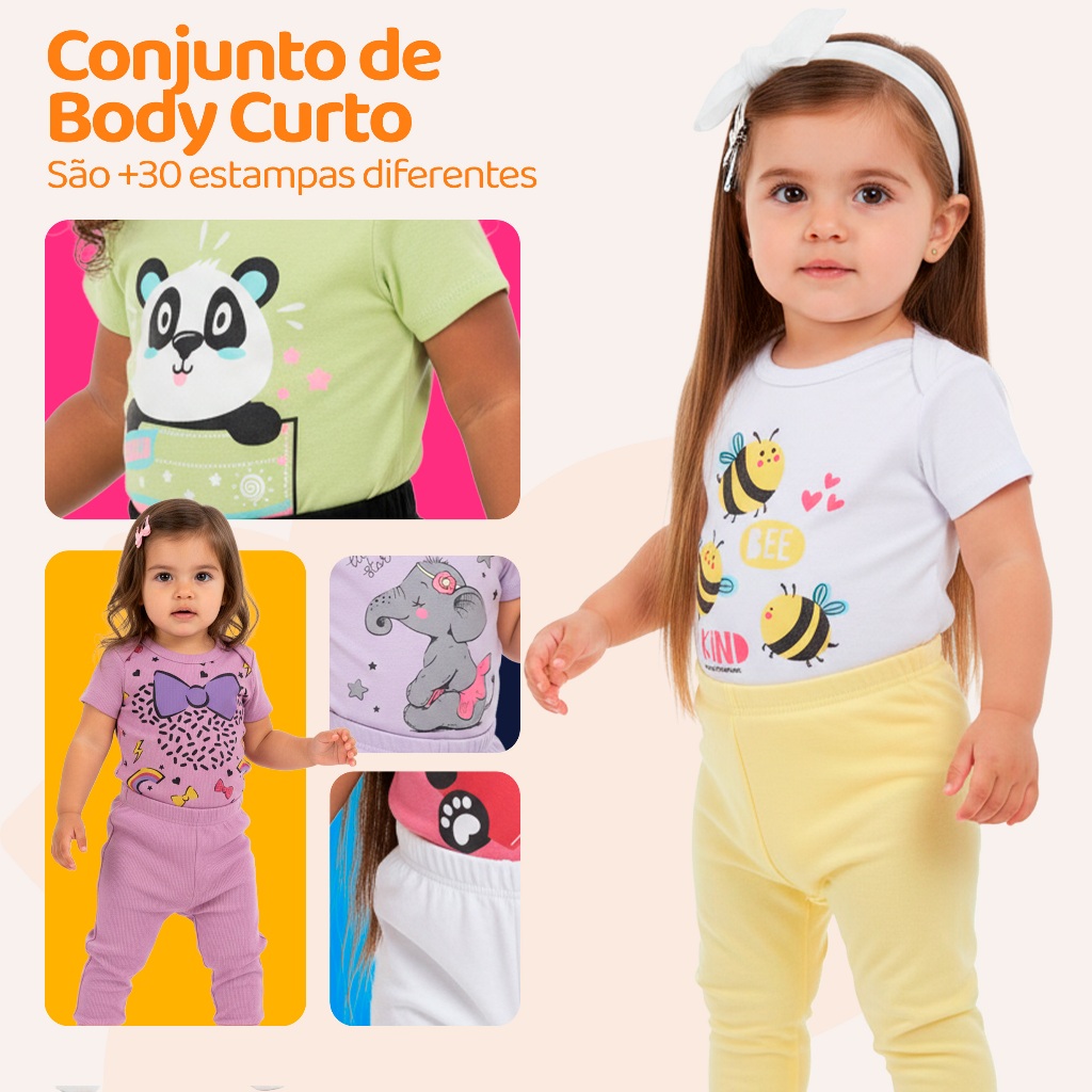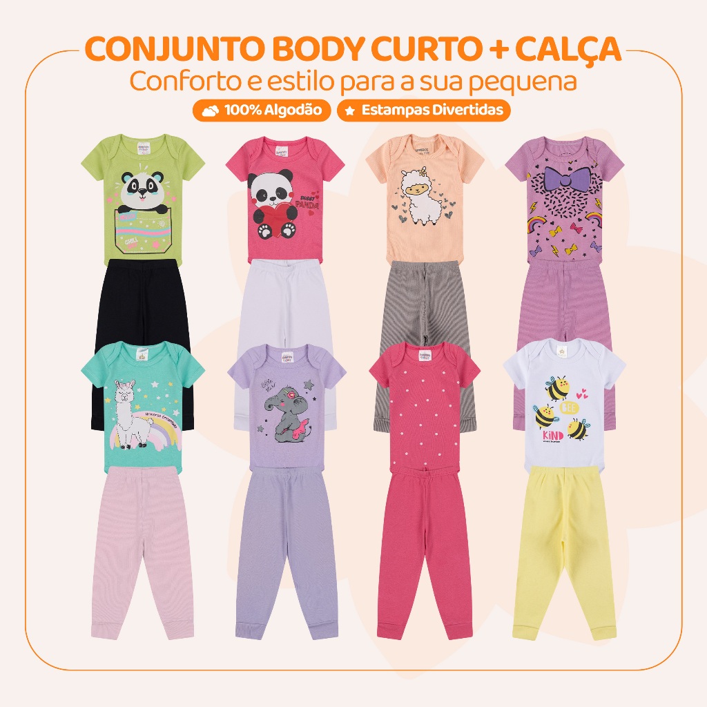 Kit 4 Peças de Roupas para Bebê Menina (2 Body Curto + 2 Calça Mijão) Kit 2 Body Roupa Infantil Bebê