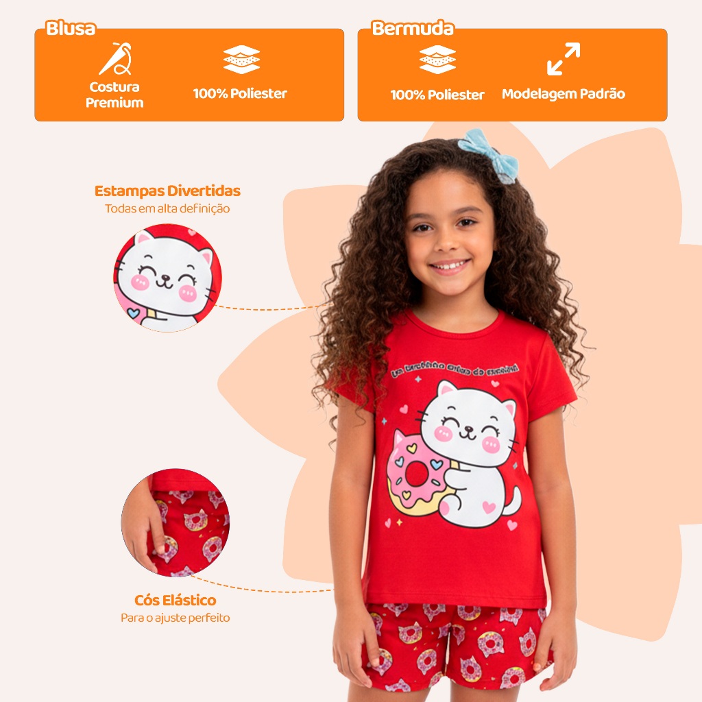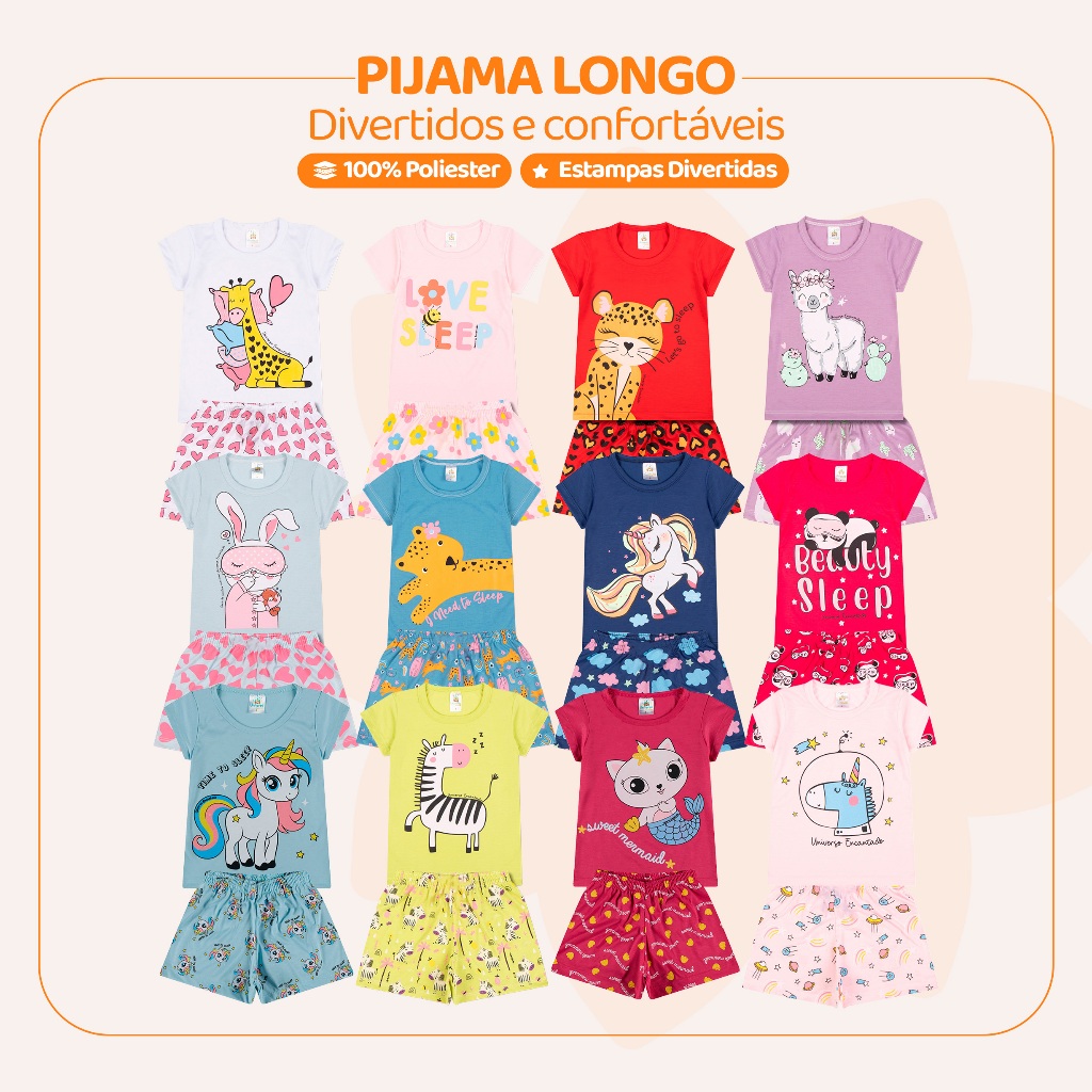 Pijama Infantil de Menina Manga Curta com Estampas Fofas e Conforto Roupa Infantil Feminino Verão Pijaminha Calor . L05