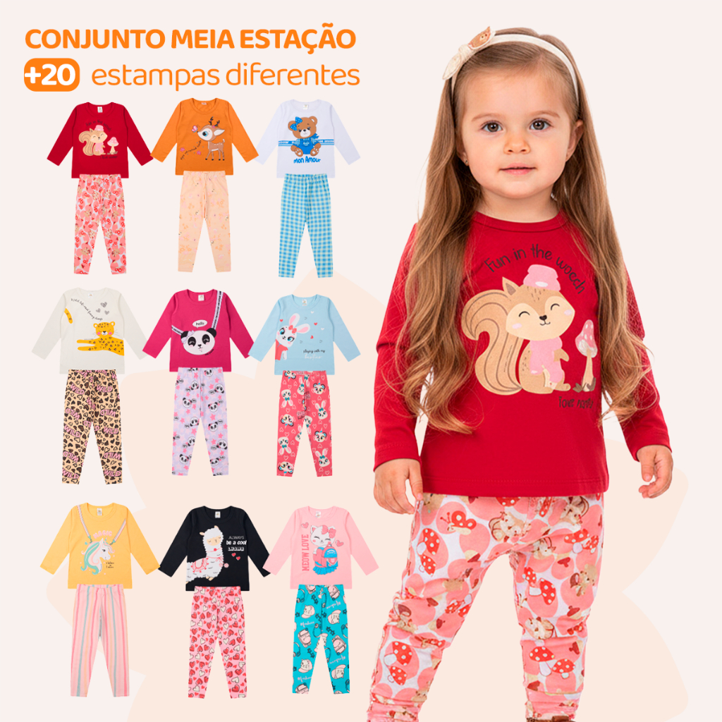 Kit Sortido 4 Peças de Roupas Feminino Infantil Inverno e Meia Estação – 2 camisas manga longa + 2 calças legging