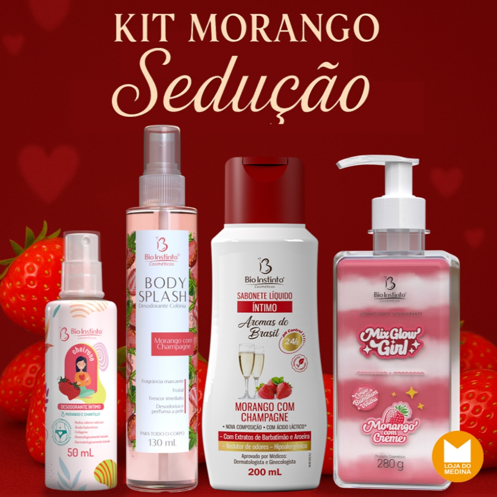 KIT MORANGO SEDUÇÃO - 04 PRODUTOS - BODY SPLASH + HIDRATANTE + SABONETE + DESODORANTE INTIMO - BIO INSTINTO