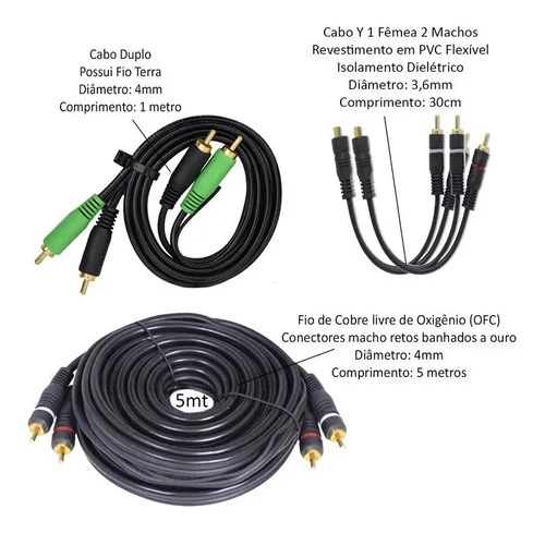 Kit Cabo RCA Borracha 5 Metros + 1 Cabo RCA 1 Metro + 2 Cabos Y 1 Fêmea 2 Machos