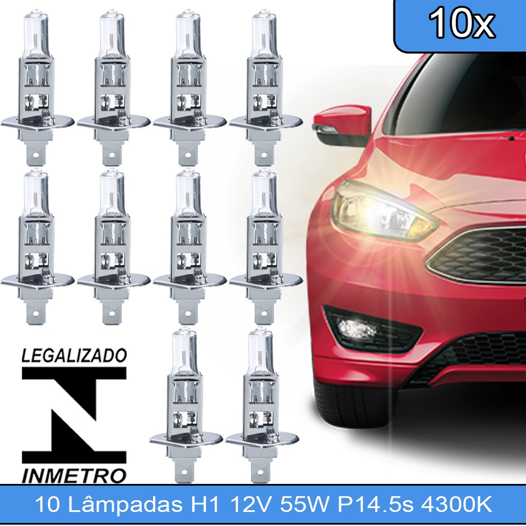 Kit com 10 Lâmpadas Automotiva Halógena H1 12V 55W para Farol de Carro