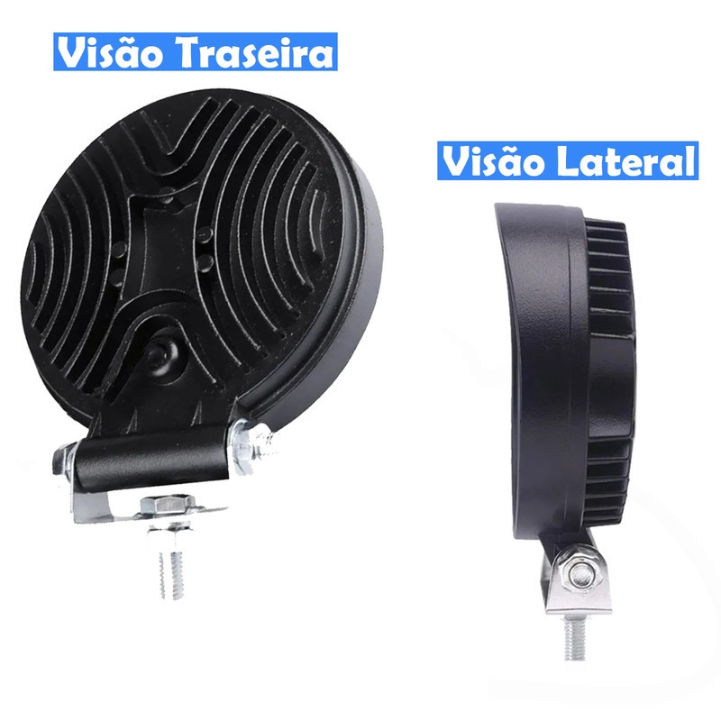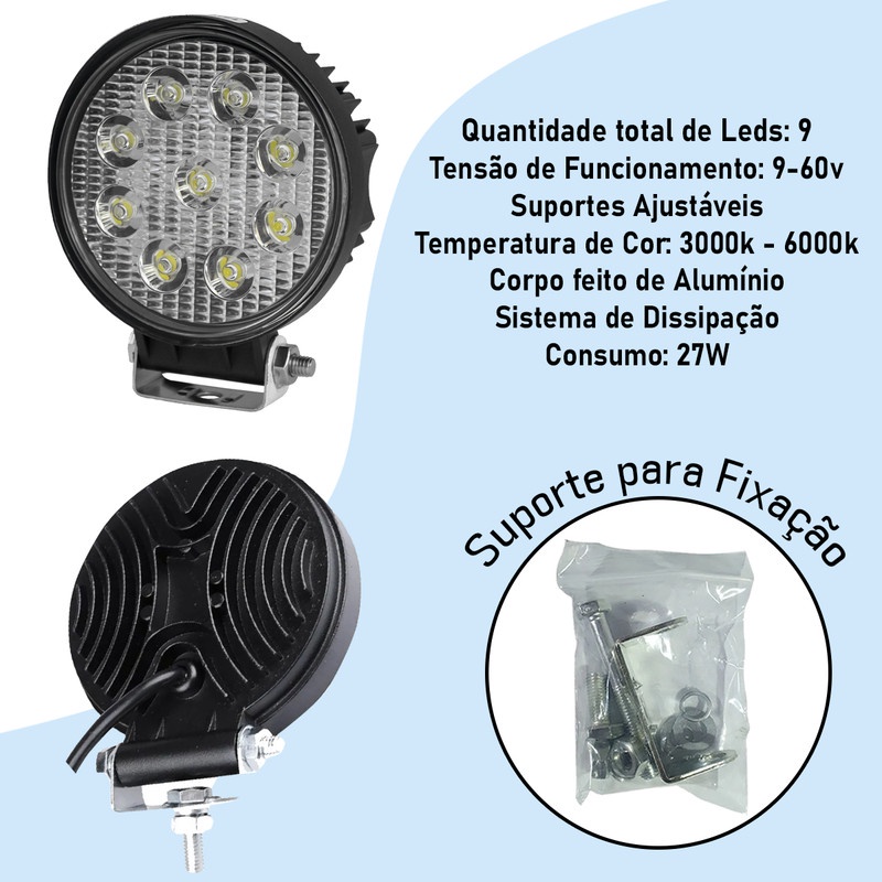 Kit com 4 Farol Farois de Milha LED Branco 9 Leds Redondo Universal 12/24V 27W 6000K Bivolt