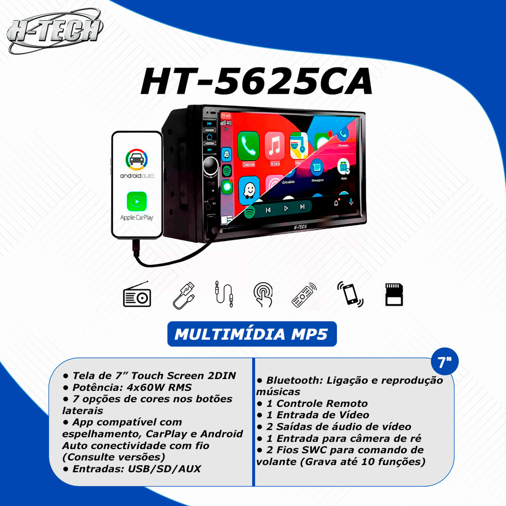 Multimidia Ht-5625ca 2 Din 7 Polegadas Carplay Android Auto Usb Sd Aux Bluetooth H-Tech